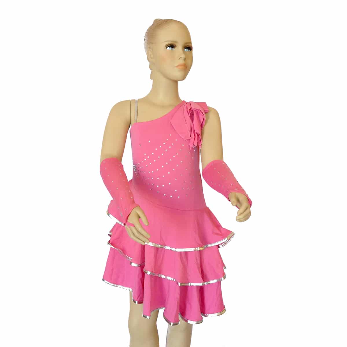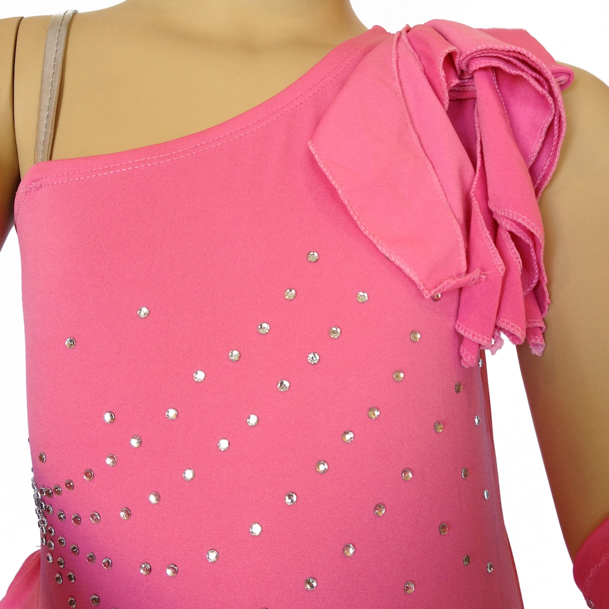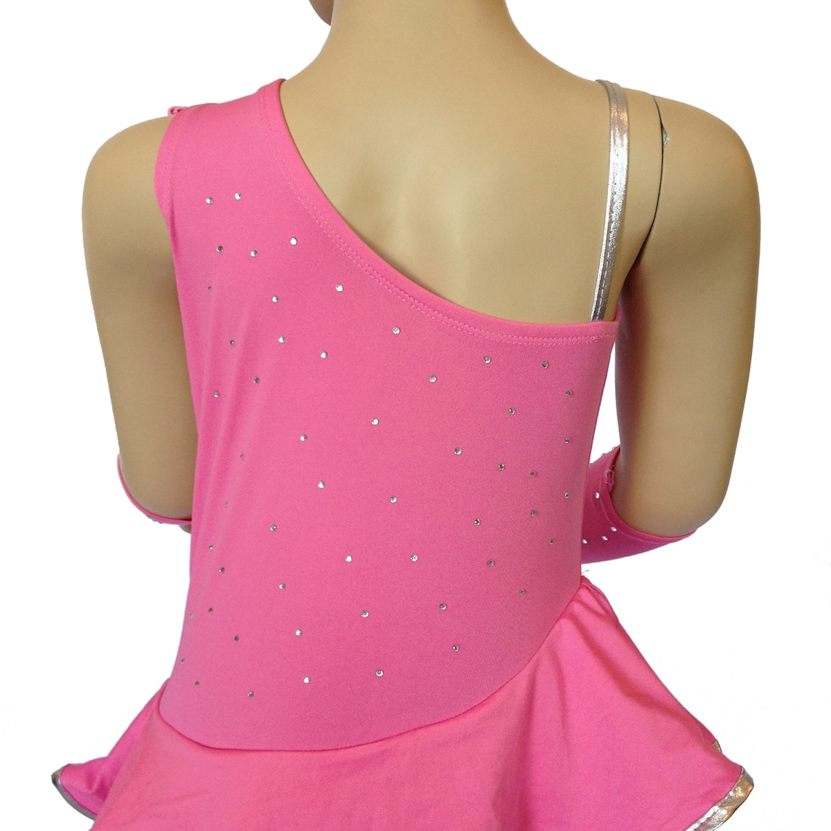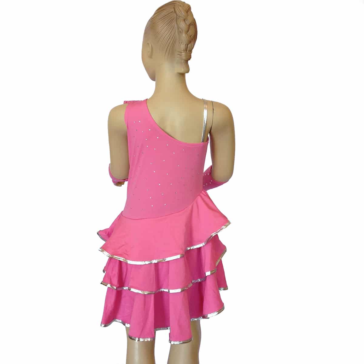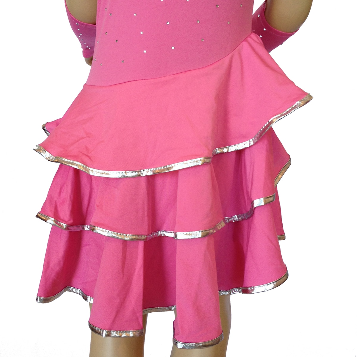 Abito da ballo per bambina elasticizzato. Le balze della gonna sono rifinite con nastro argentato, mentre i punti luce nell’abito lo rendono ancora più sbarazzino e luminoso. I guanti e lo slip sono inclusi.