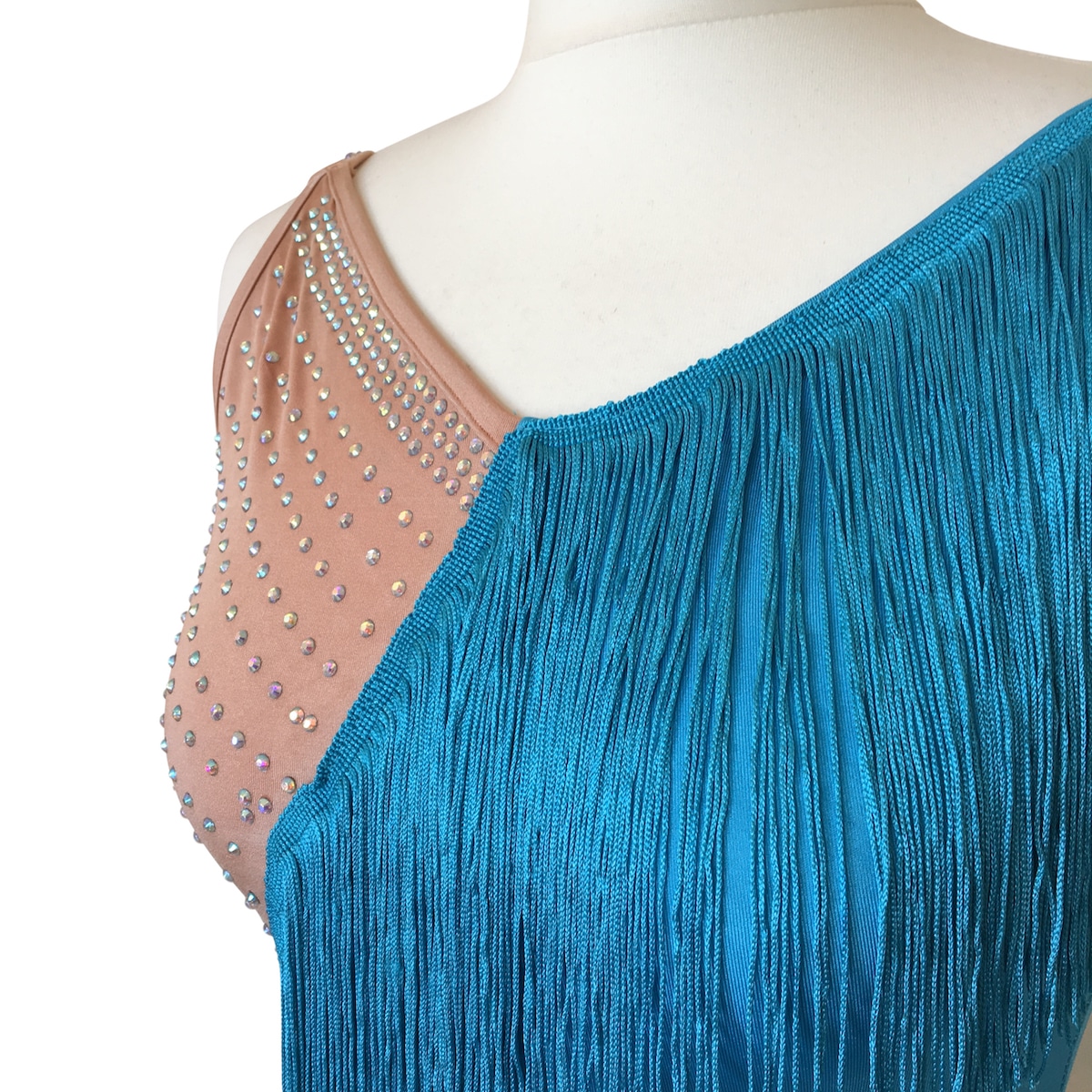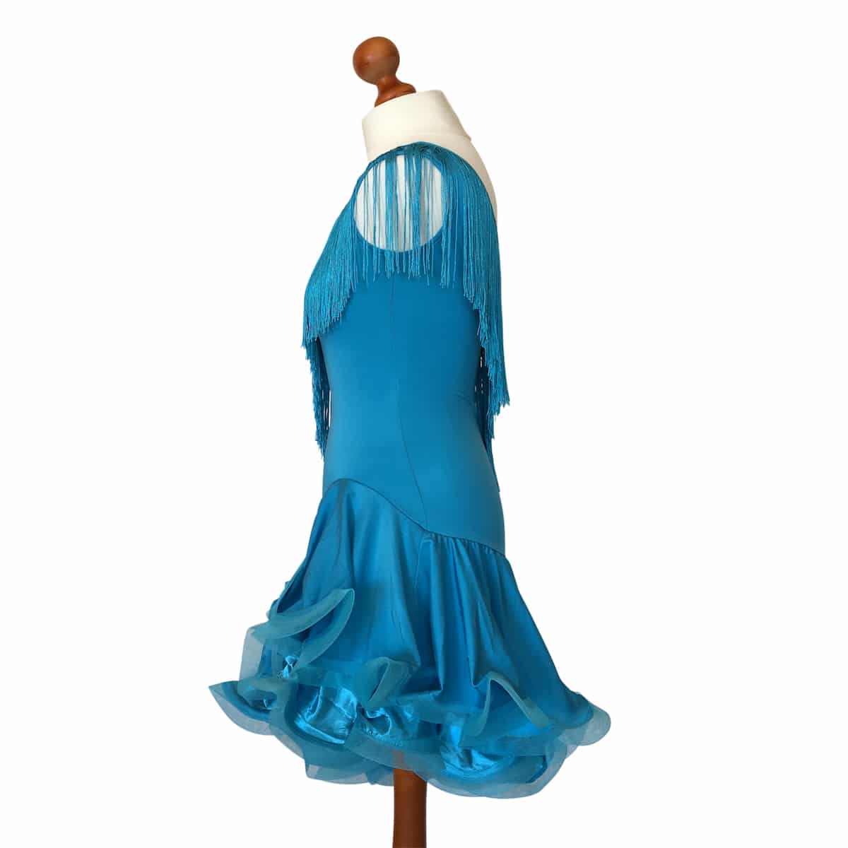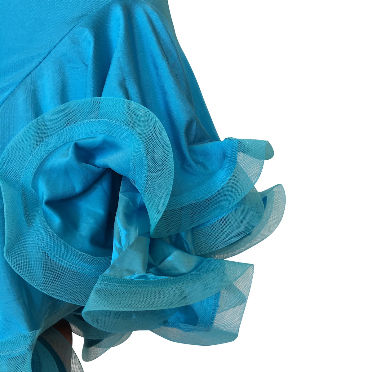 Elegante abito da ballo da donna con bratelline impreziosito da strass nel busto lato destro. Lunga frangia trasversale dalla spalla al fianco in colore turchese. La gonna è formata da ampi volant.