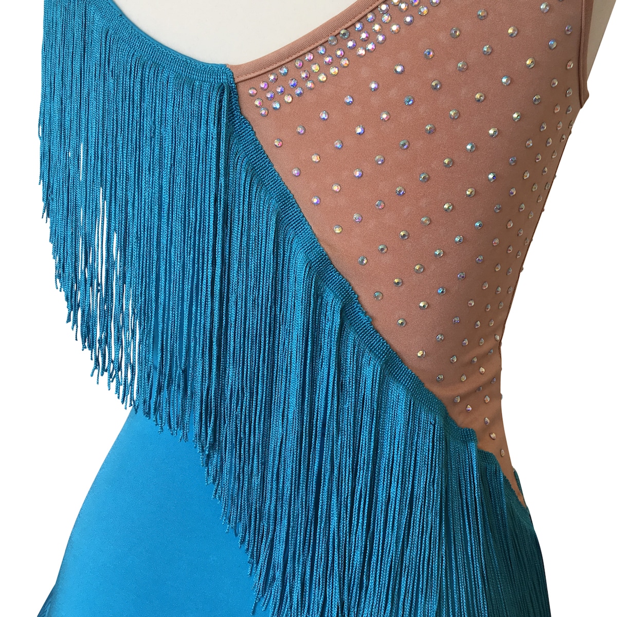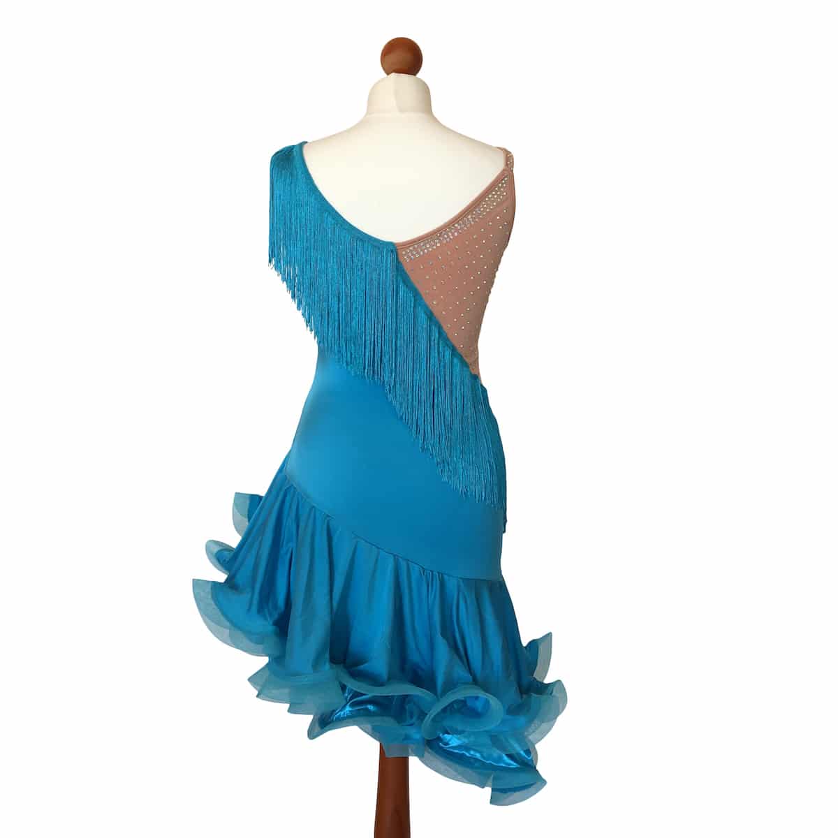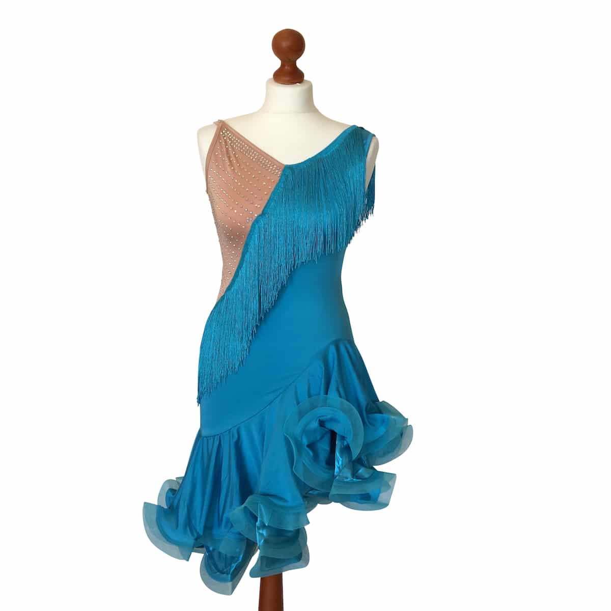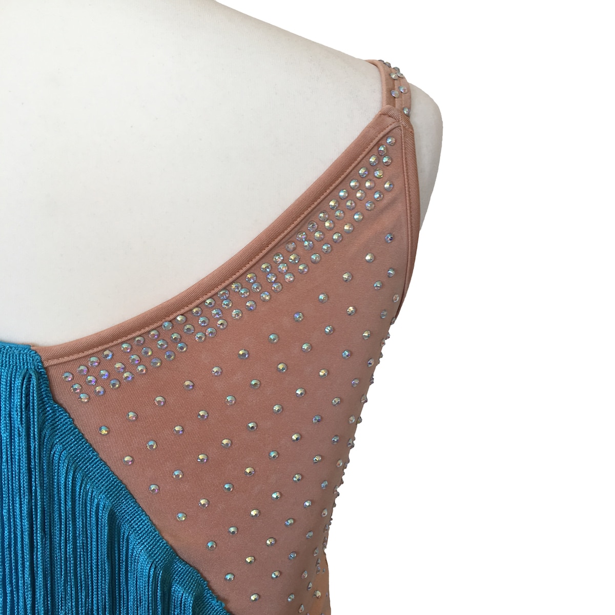 Elegante abito da ballo da donna con bratelline impreziosito da strass nel busto lato destro. Lunga frangia trasversale dalla spalla al fianco in colore turchese. La gonna è formata da ampi volant.