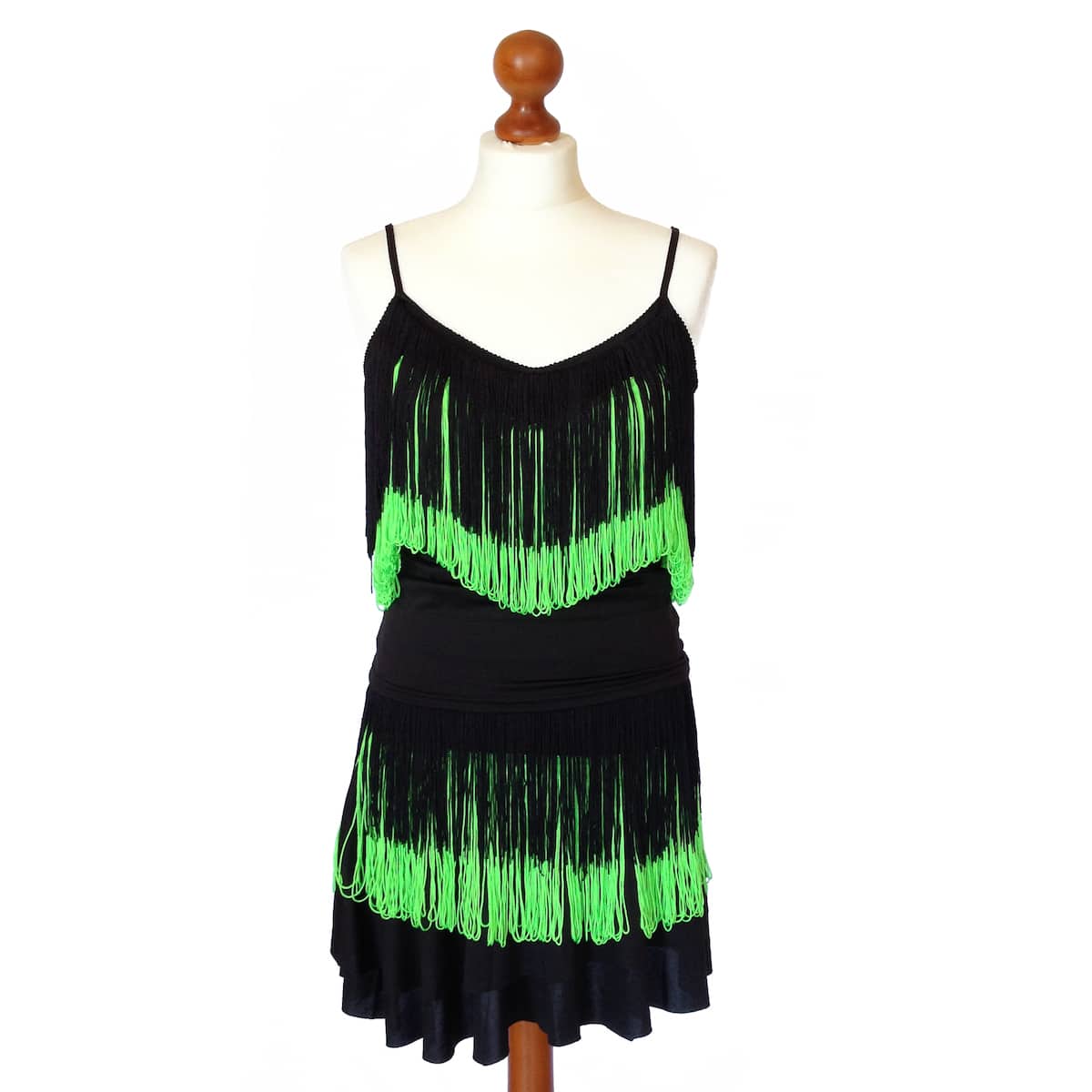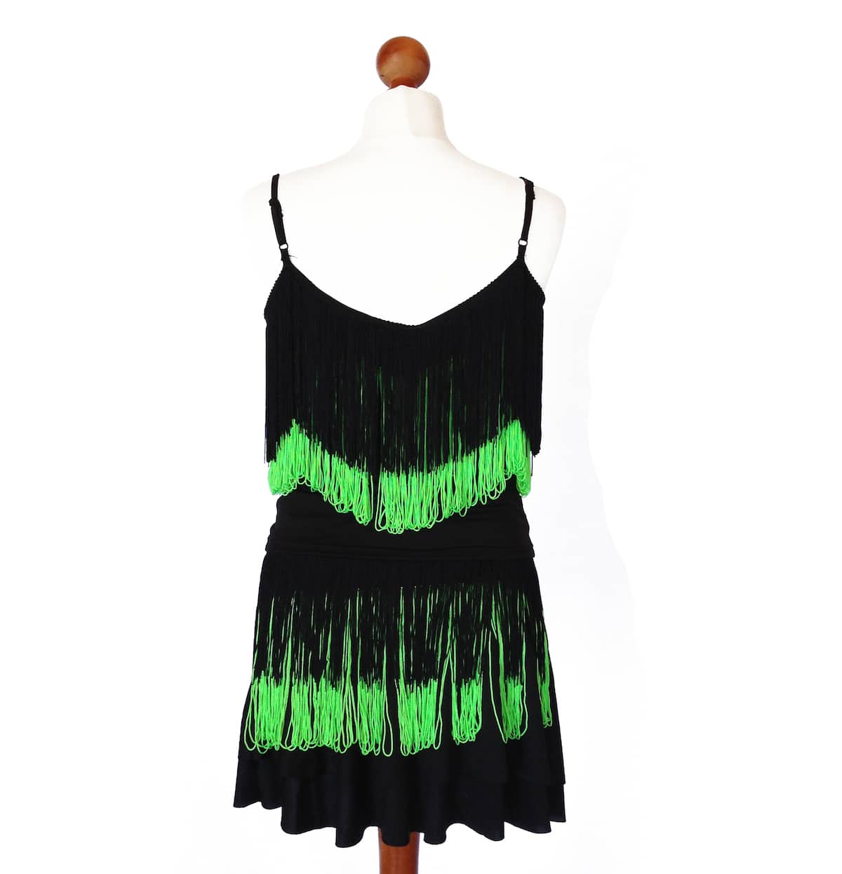 Abito da ballo a due pezzi per donna con canotta e gonna a frangia bicolore verde e nero.