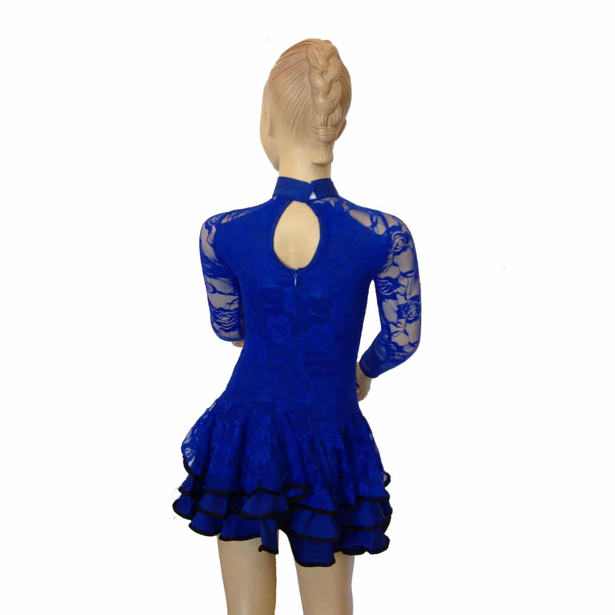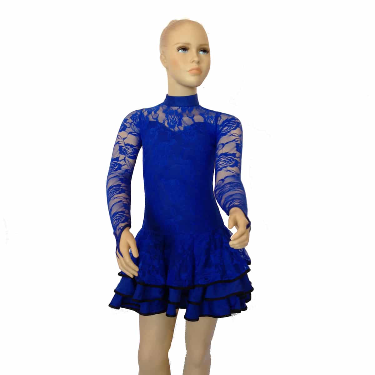 Abito da ballo intero per bambina e ragazza, realizzato in pizzo elasticizzato. Sotto collo e maniche con rose ricamate trasparenti. Scollo con chiusura sul retro e gonna a balze. Ideale per competizioni FIDS di classe D.