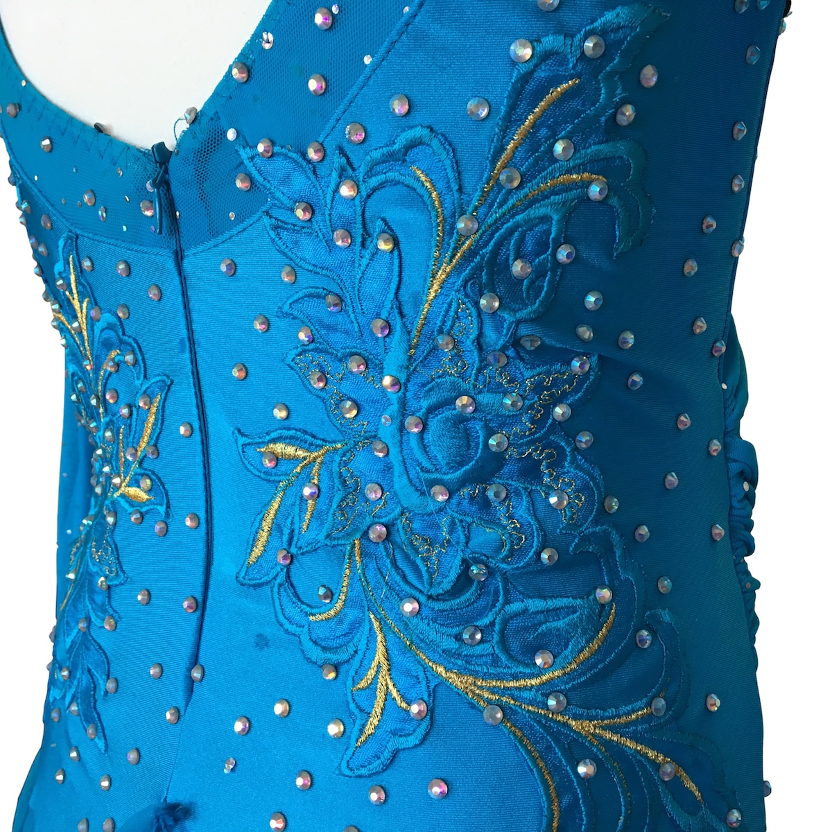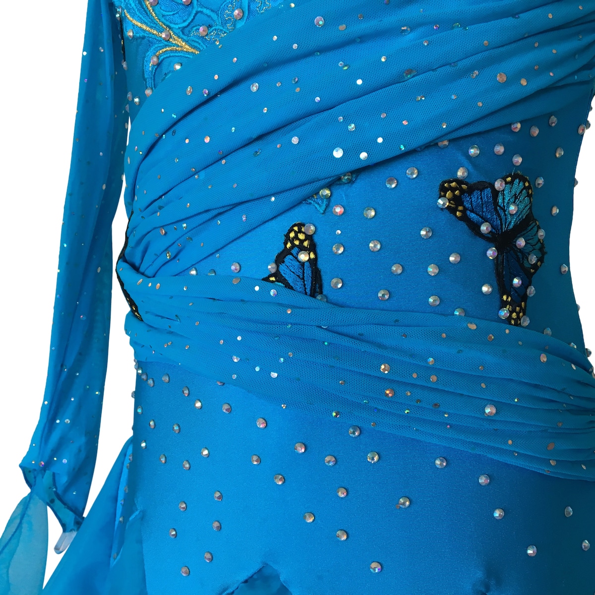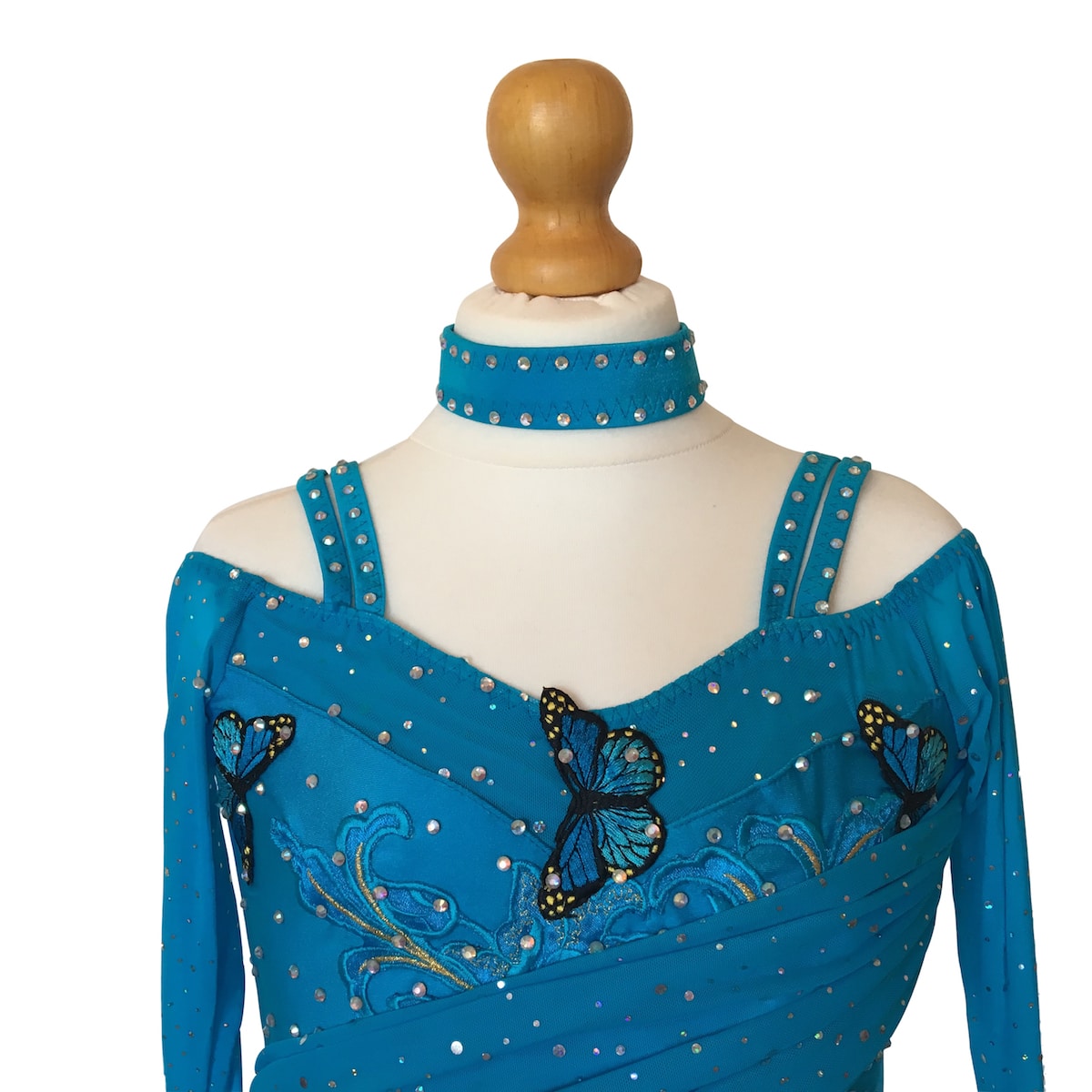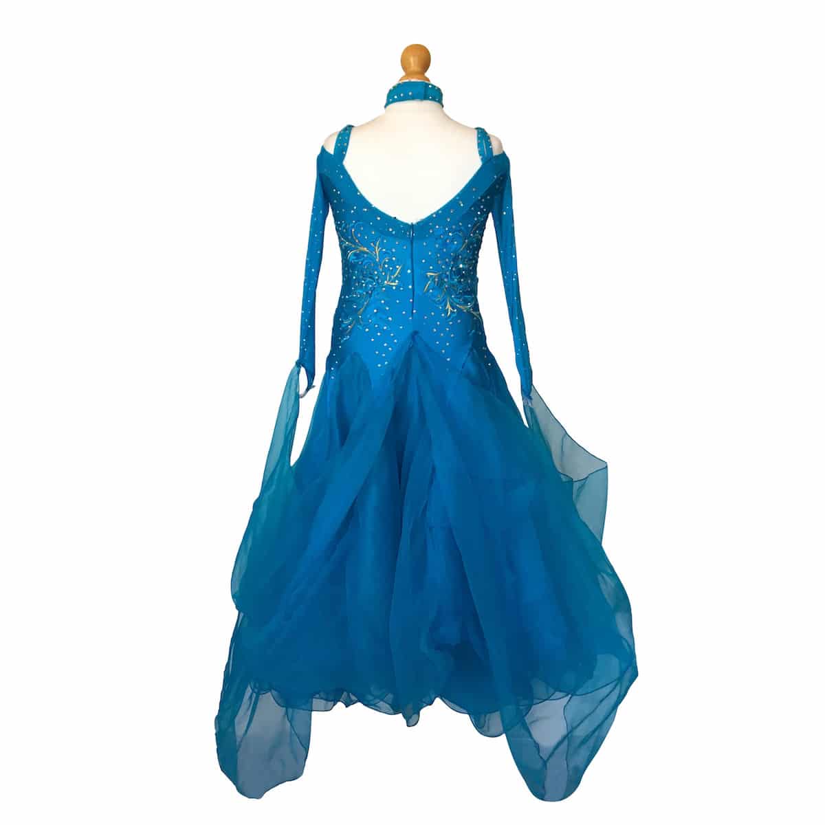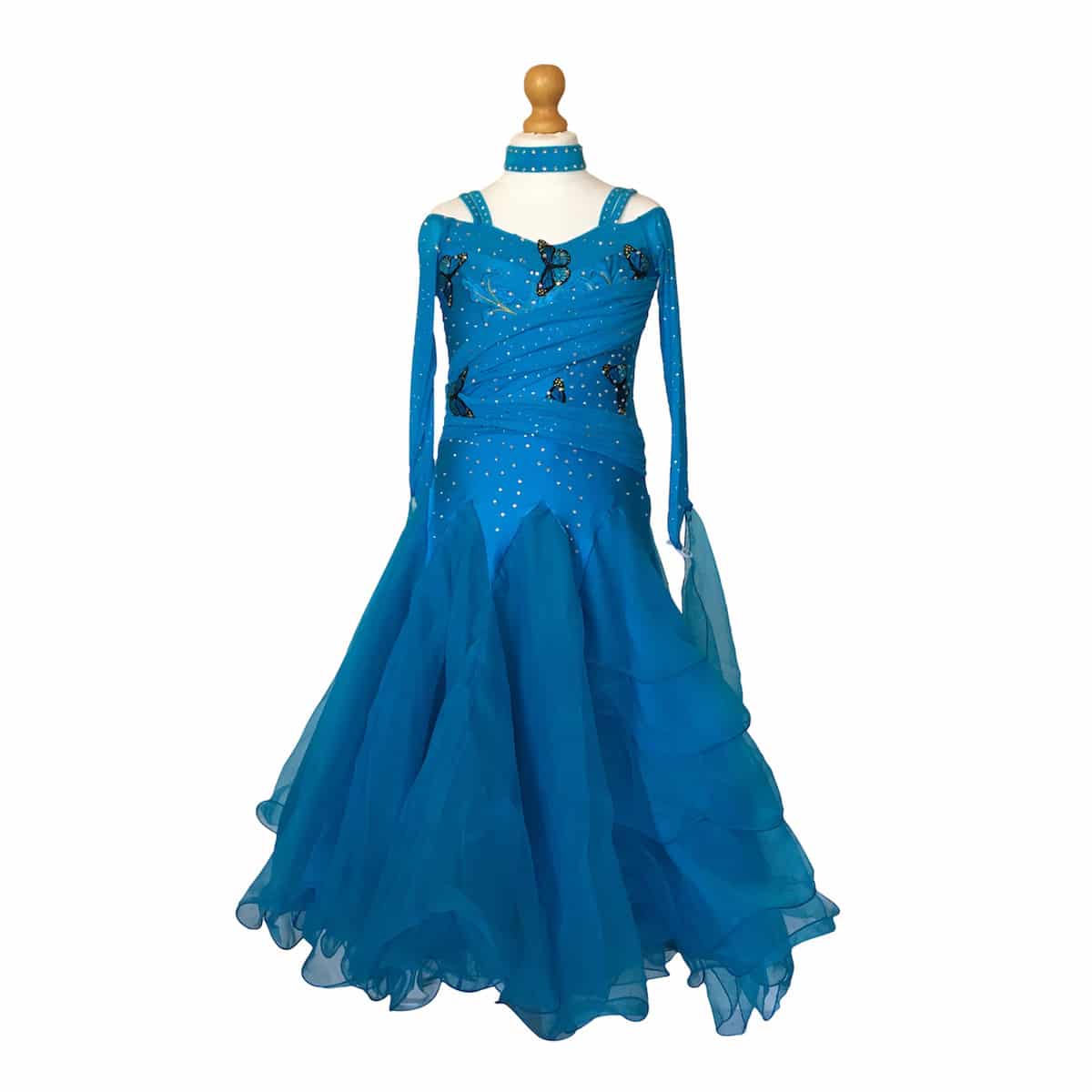 Abito da ballo standard per bambina e ragazza realizzato in organza e morbida lycra. La parte superiore è arricchita di strass PD aurora boreale e farfalle, la parte posteriore ha dei richiami floreali dorati. I veli sono anch’essi in organza e la collana è inclusa.