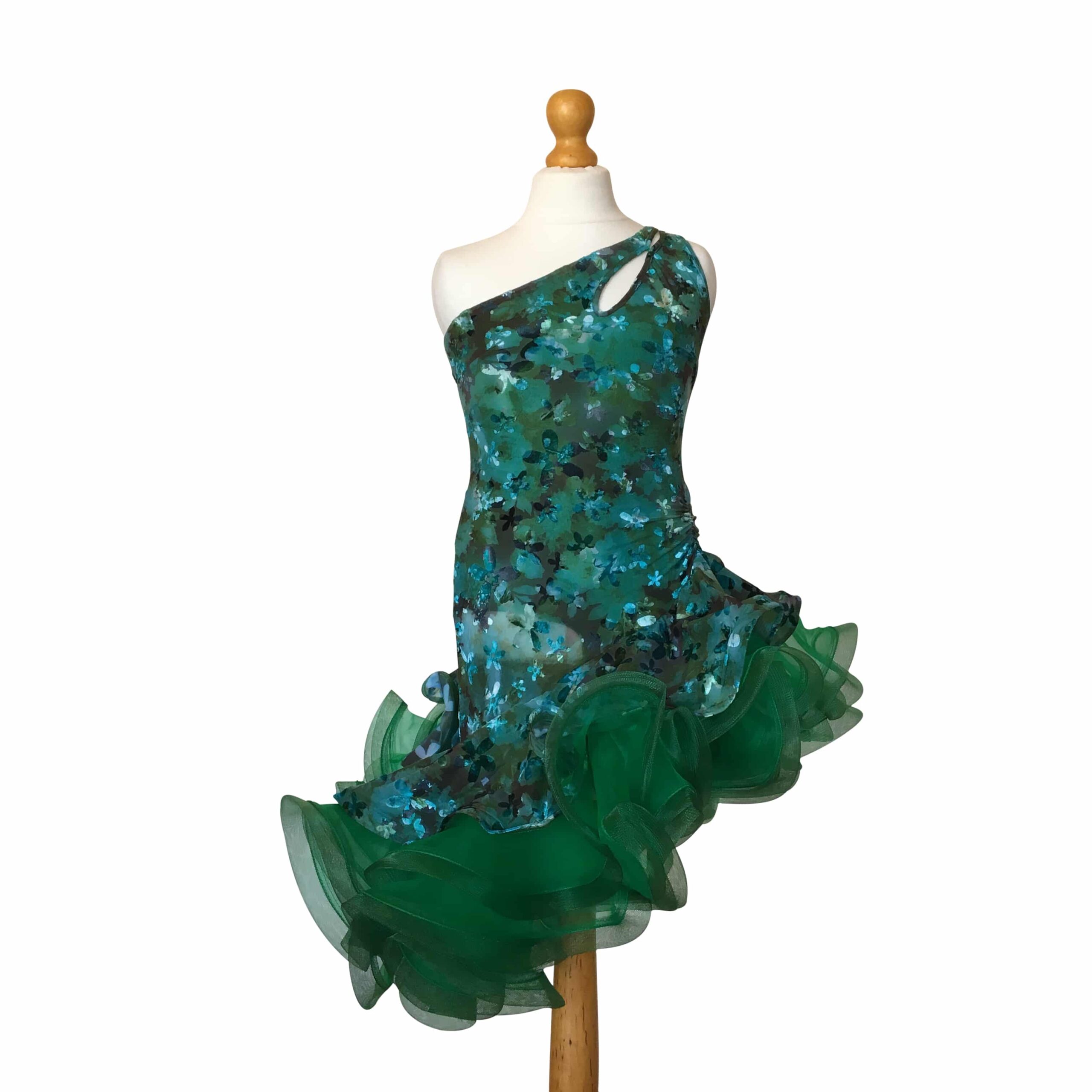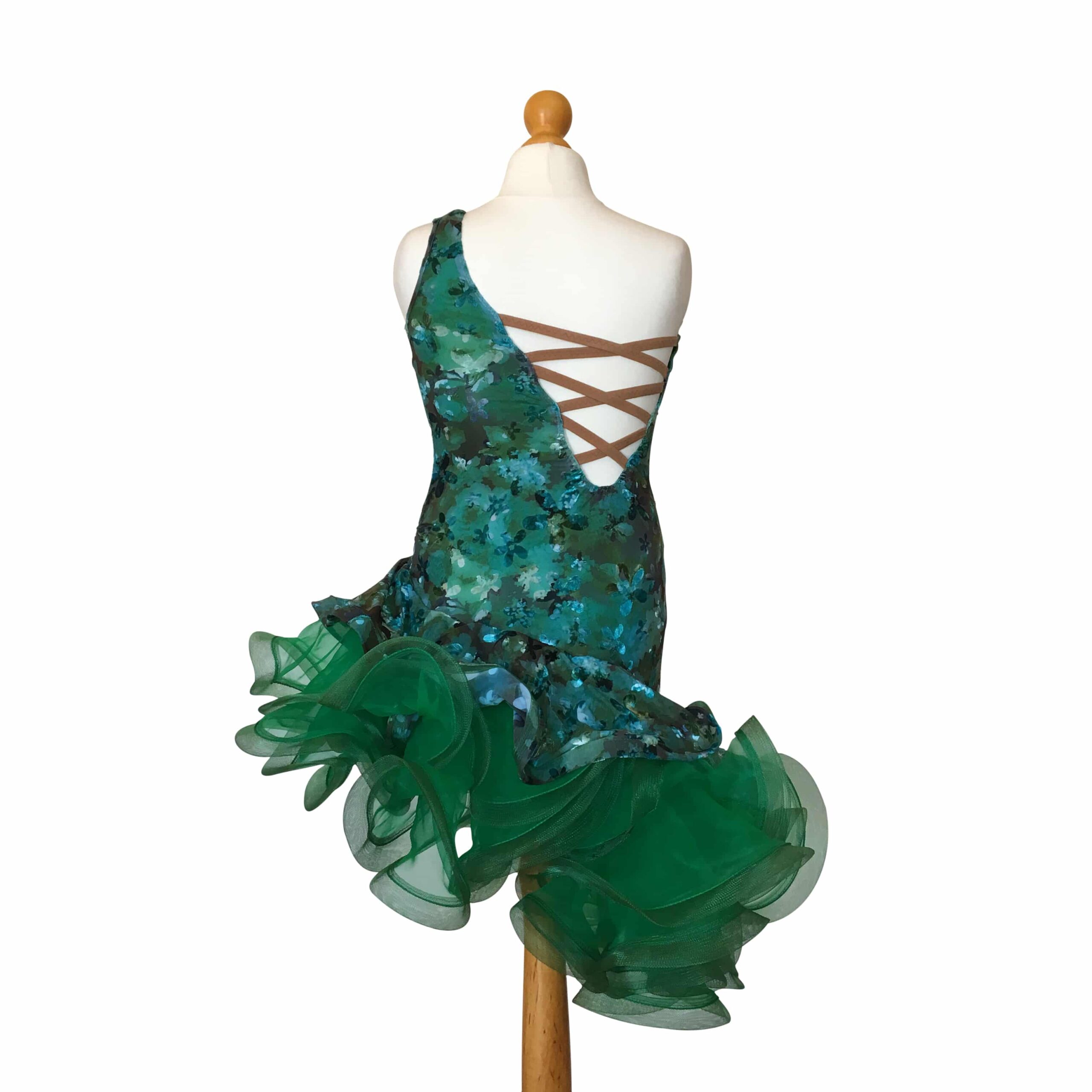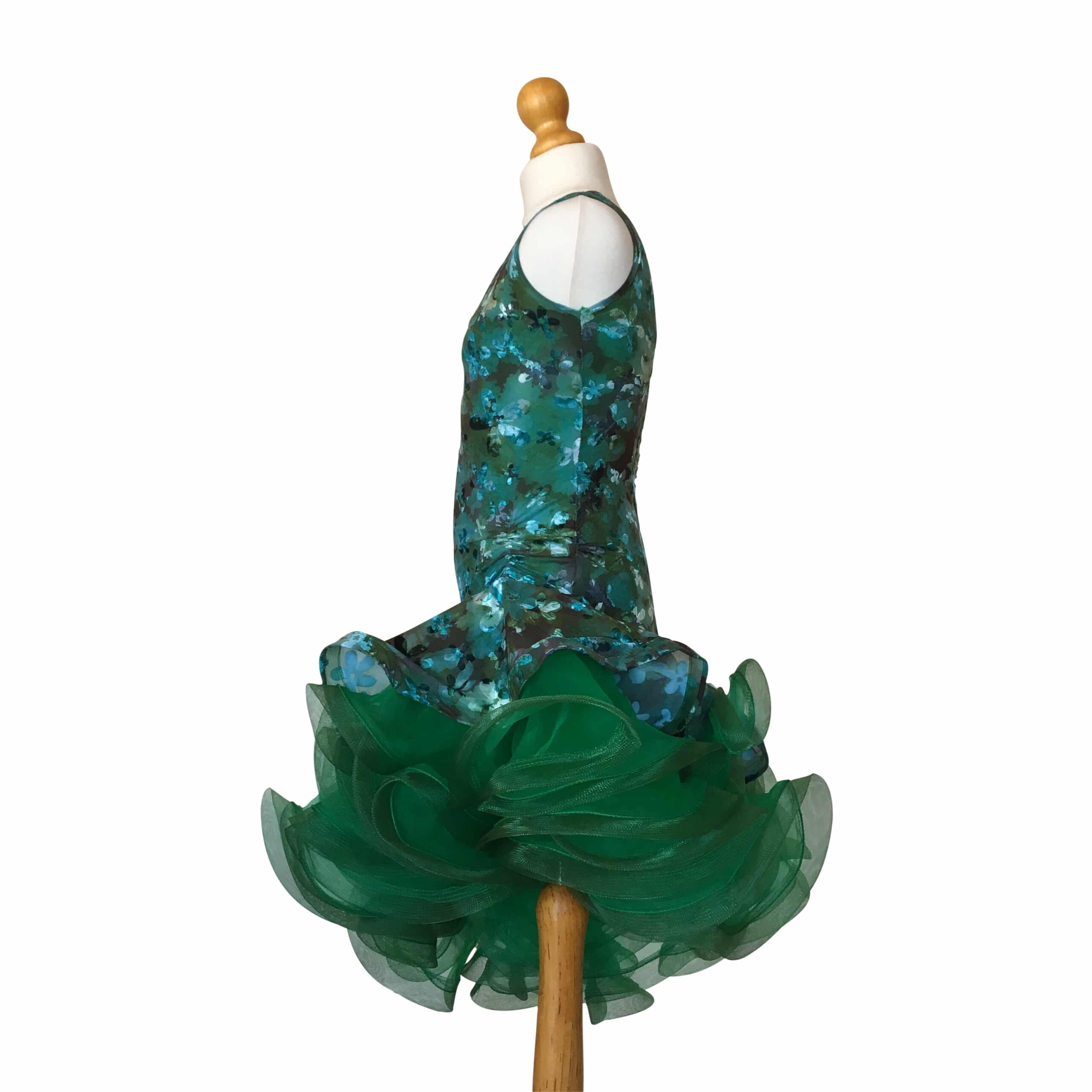 Abito da ballo intero per ragazza e bambina indicato per competizioni, realizzato in lycra maculata e ampia balza in organza verde scuro, presenta un’arricciatura sul fianco sinistro e una parte velata su quello destro che corre verso il basso.
