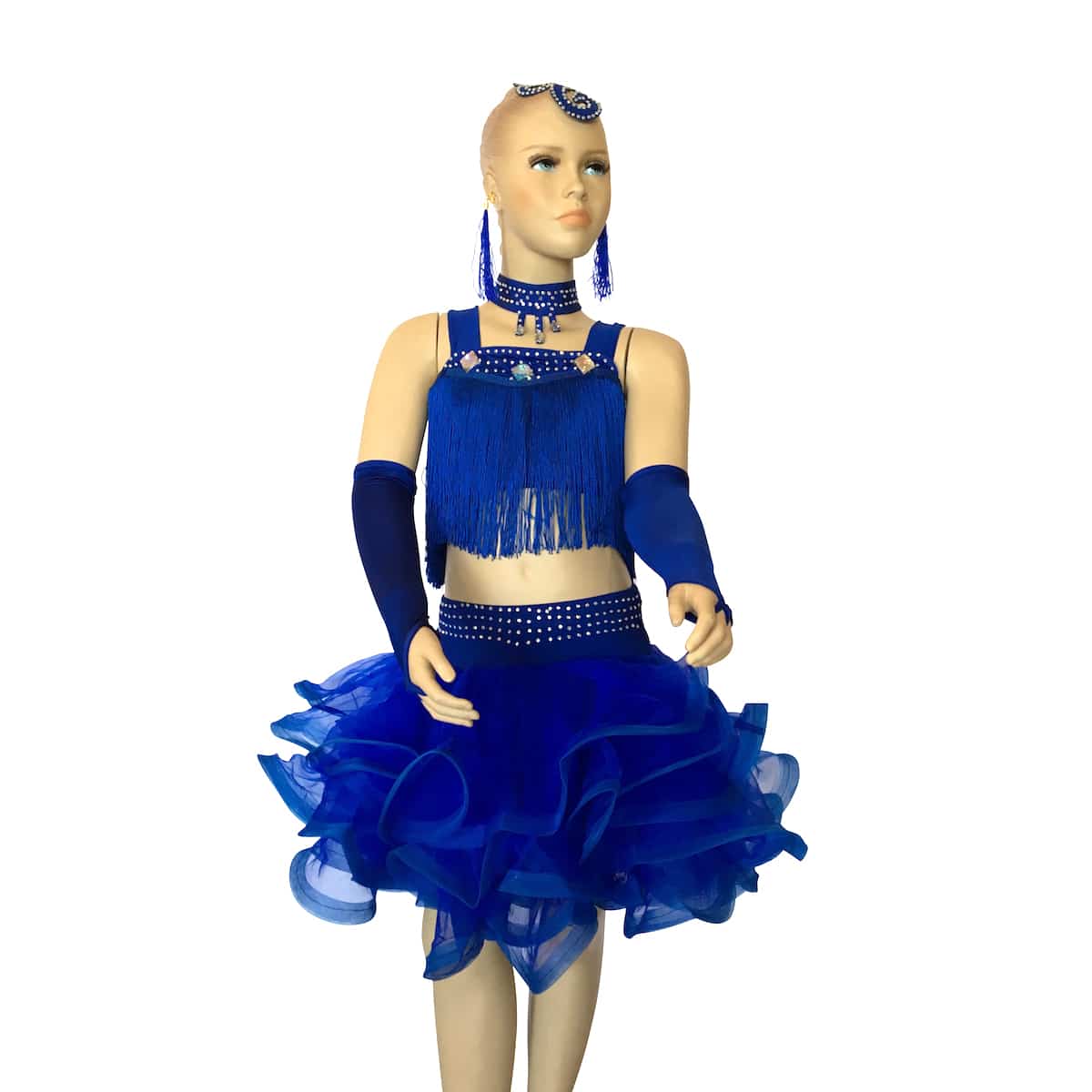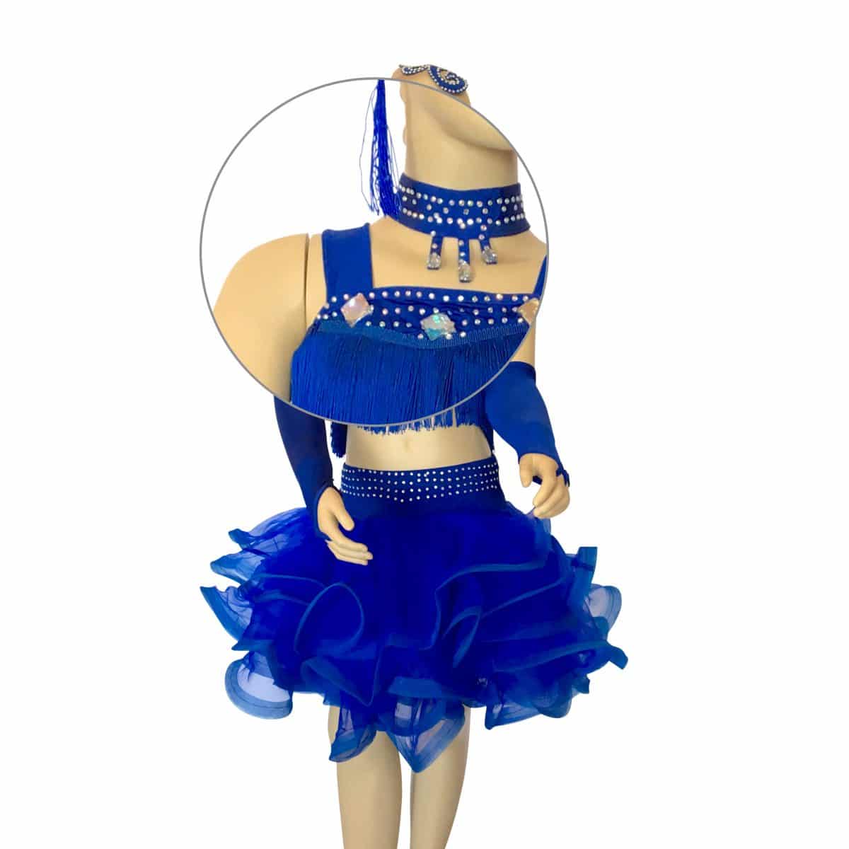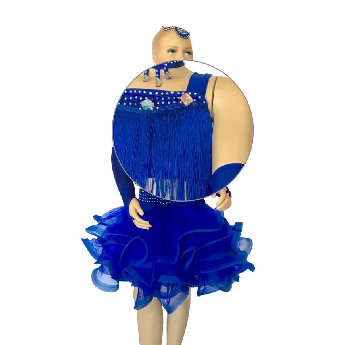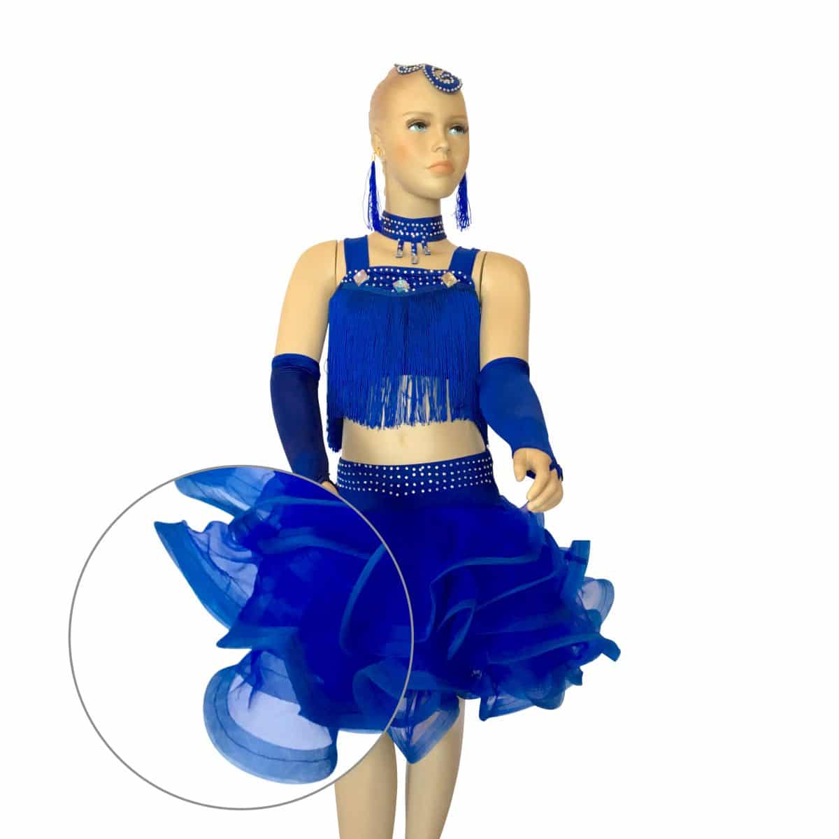 Completo da ballo latino con top in maglina con frangia, strass e pietre. Gonna con ampie balze arricciata in organza. Collana, guanti, orecchini e applicazione per capelli inclusi.