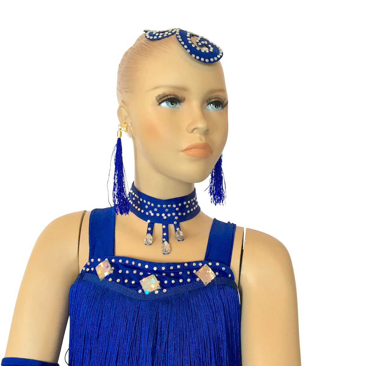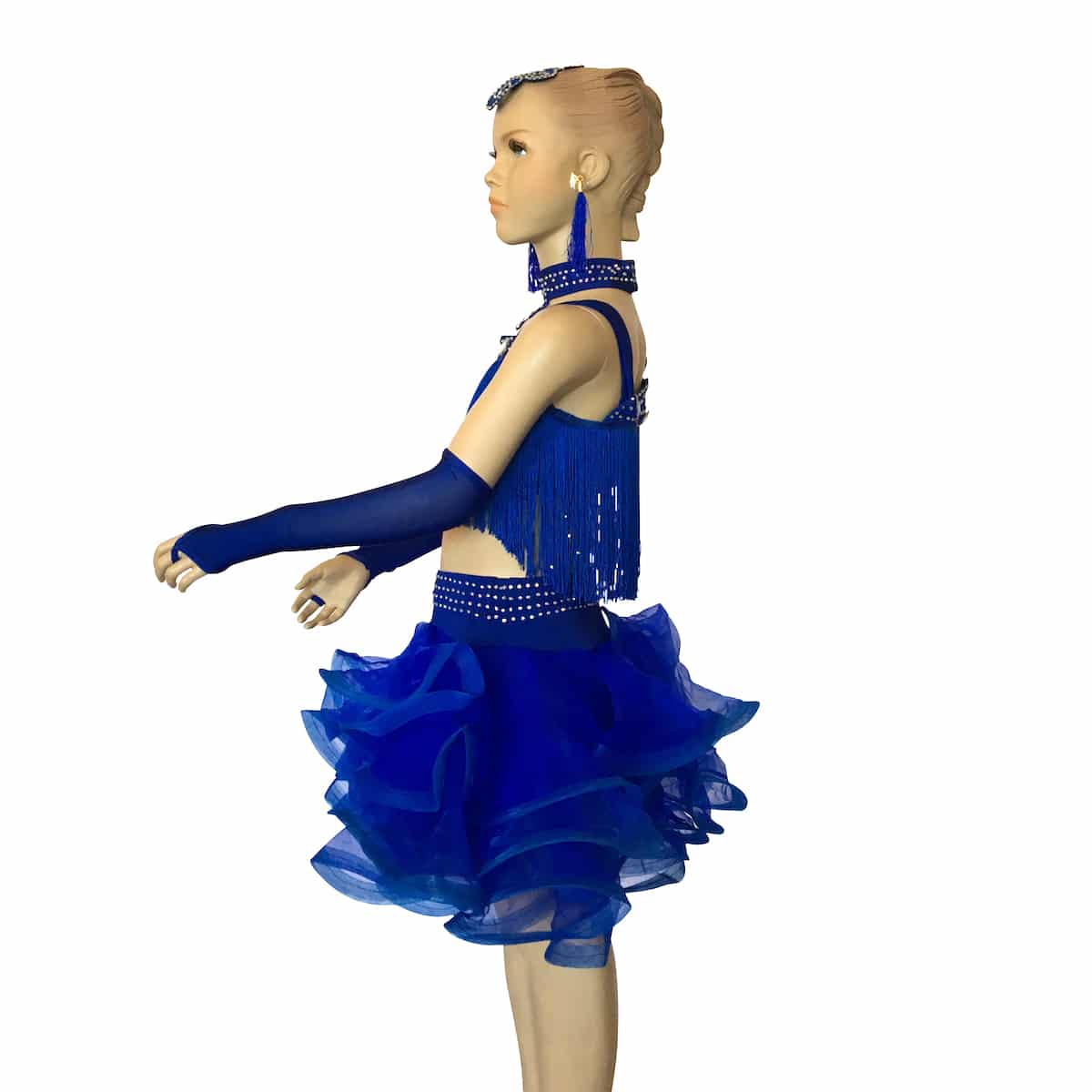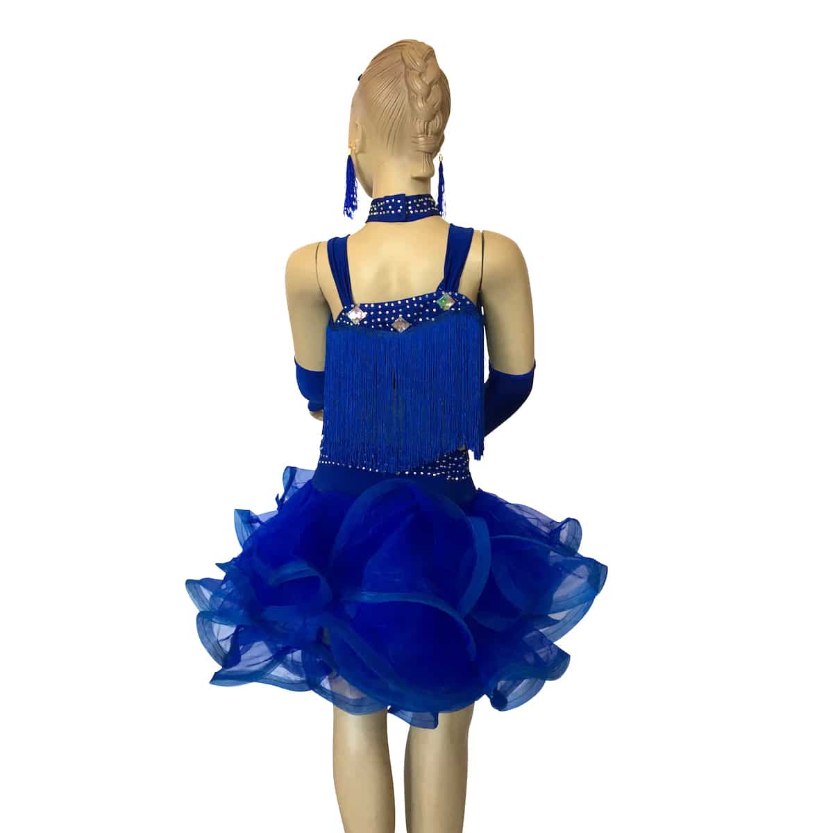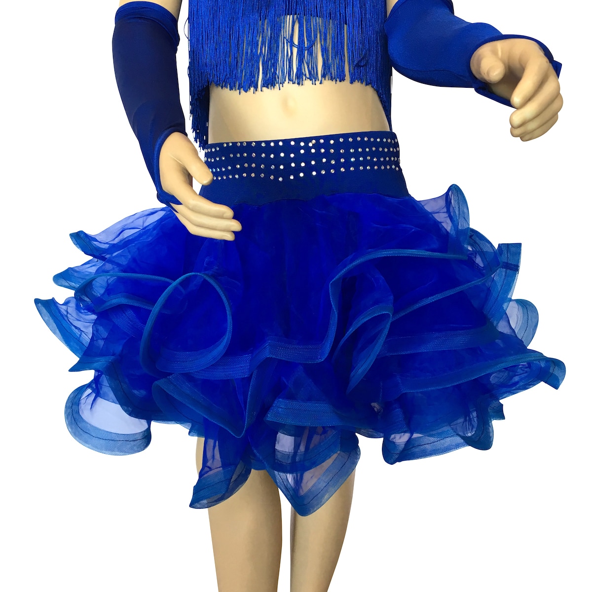 Completo da ballo latino con top in maglina con frangia, strass e pietre. Gonna con ampie balze arricciata in organza. Collana, guanti, orecchini e applicazione per capelli inclusi.