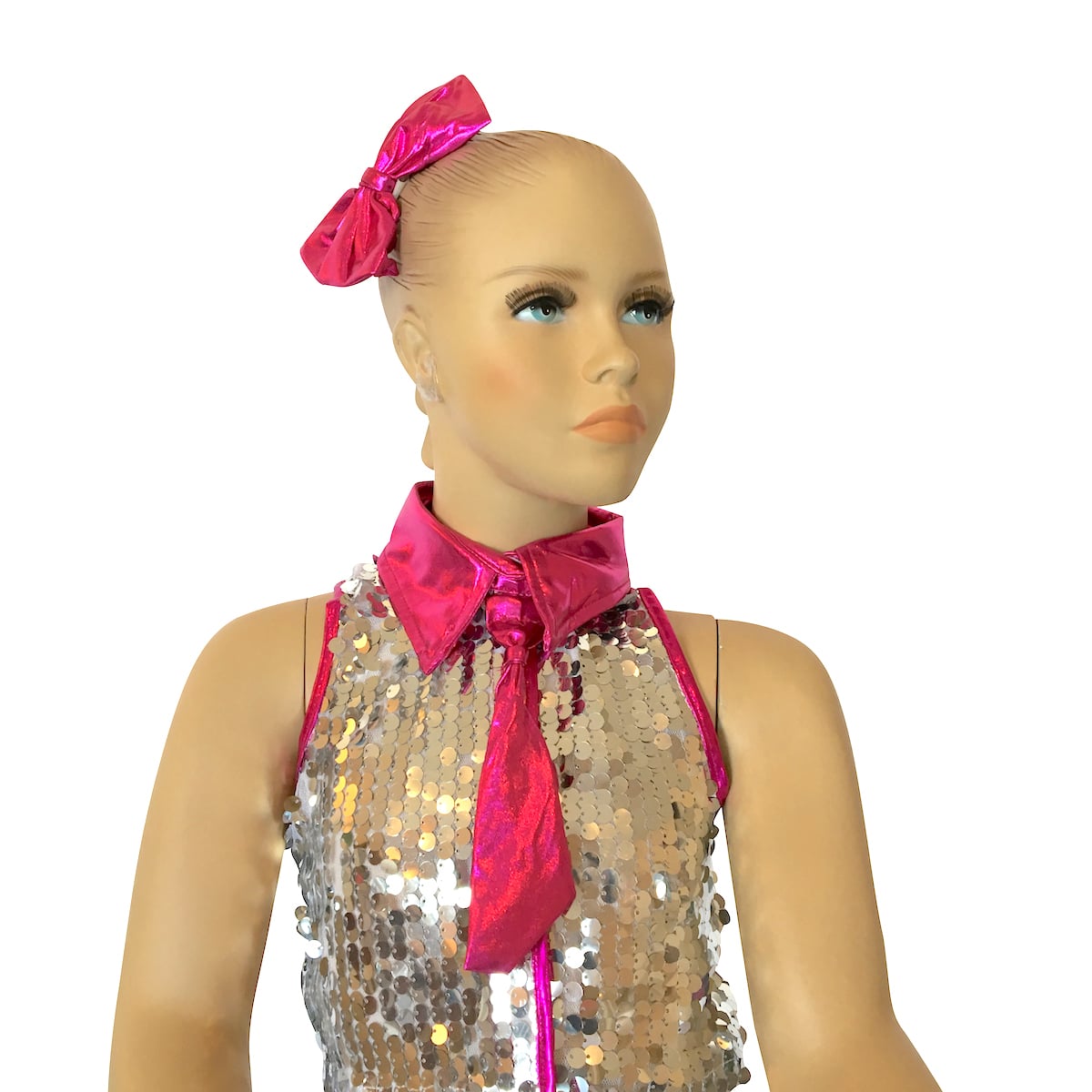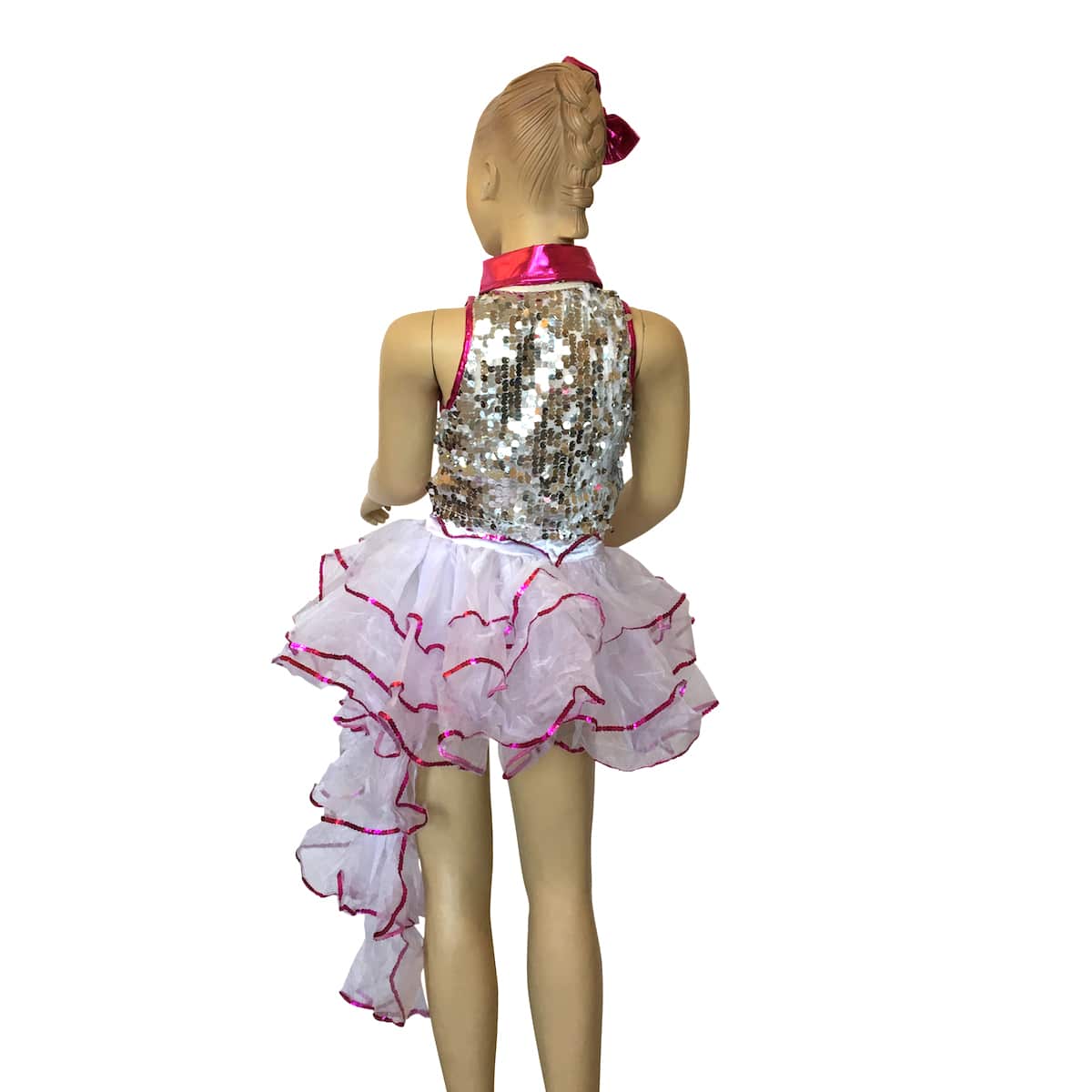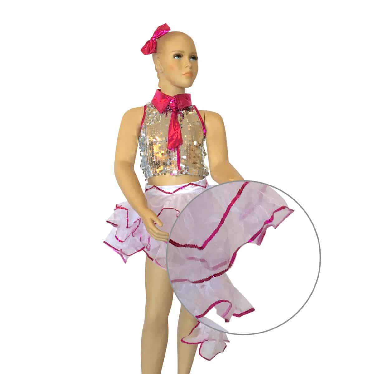 Completo danze coreografiche e show dance con top in paillettes argento e gonna con coda laterale in organza. Fiocco per capelli incluso.