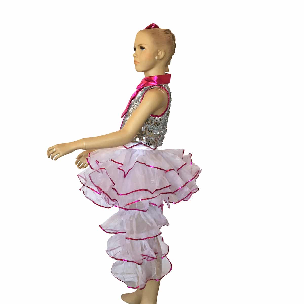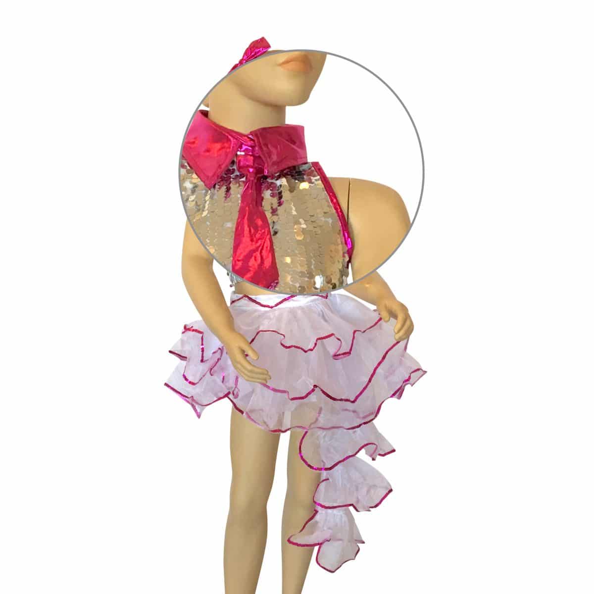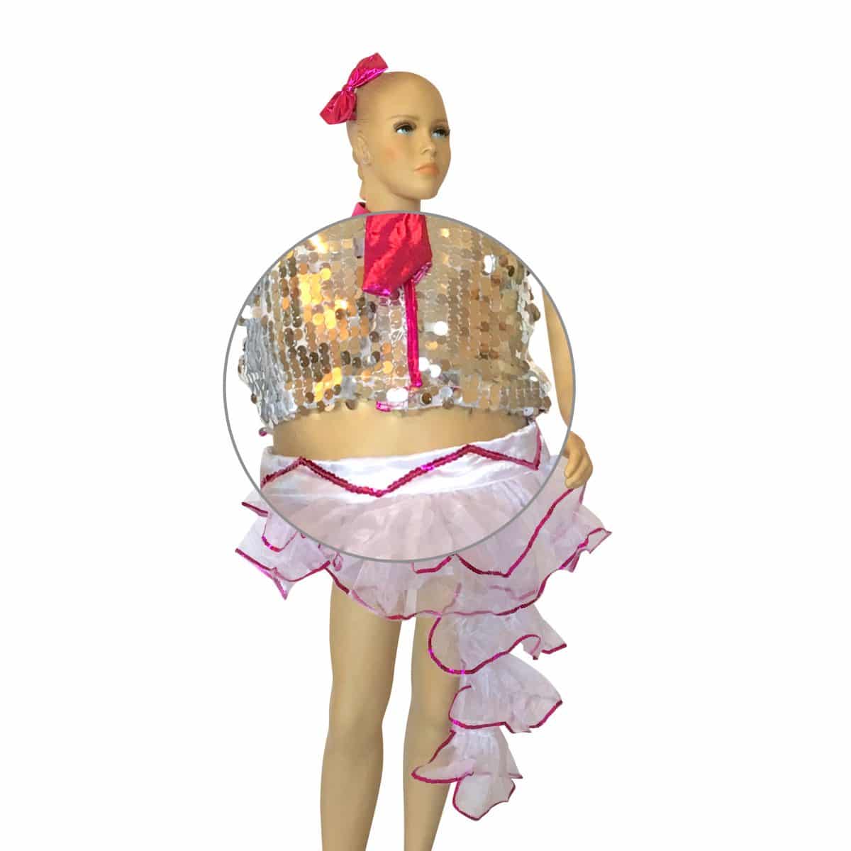 Completo danze coreografiche e show dance con top in paillettes argento e gonna con coda laterale in organza. Fiocco per capelli incluso.