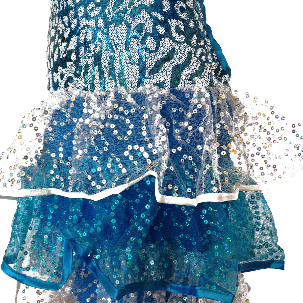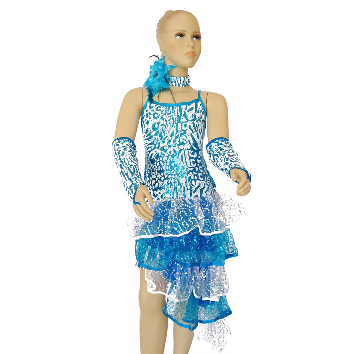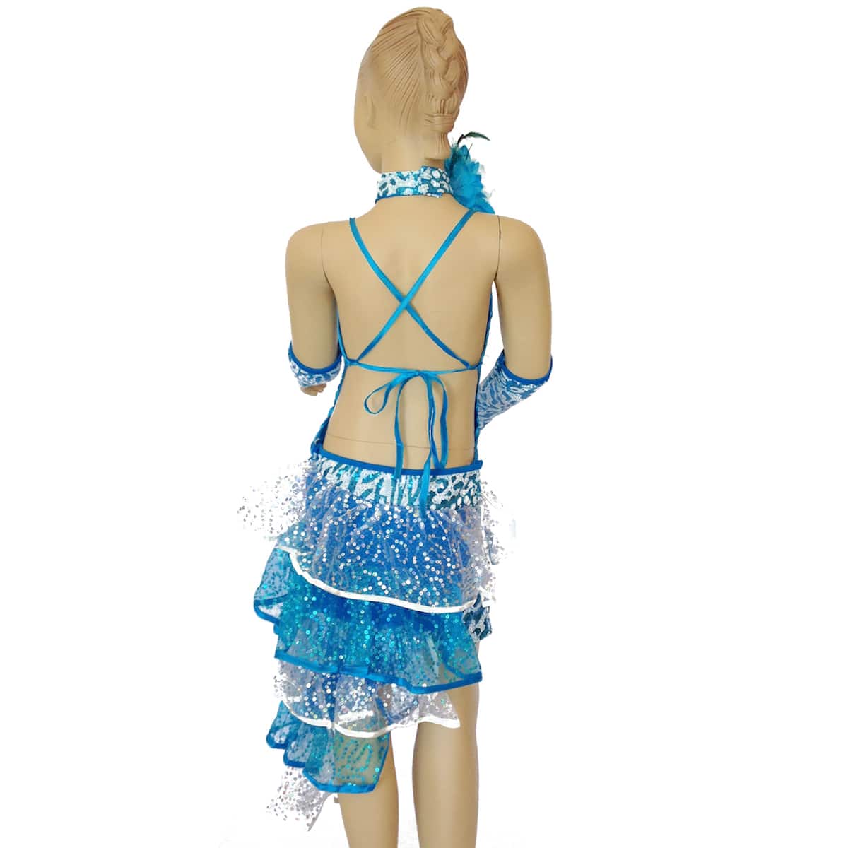 Abito danze latino americane in tessuto laminato con pailettes. Coda laterale con ampie balze di organza impreziosita di paillette. Collana con fiore precucito e guanti in tinta.