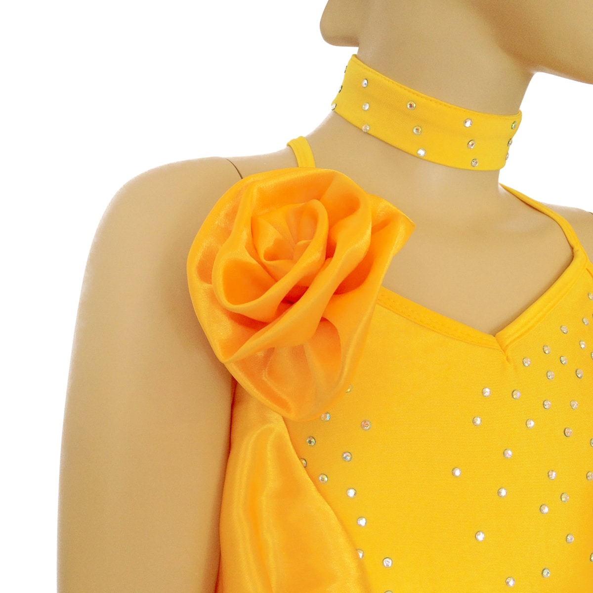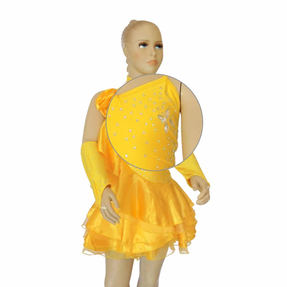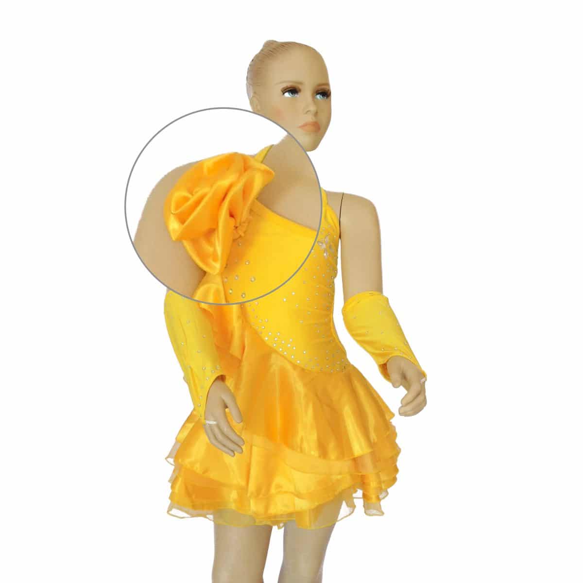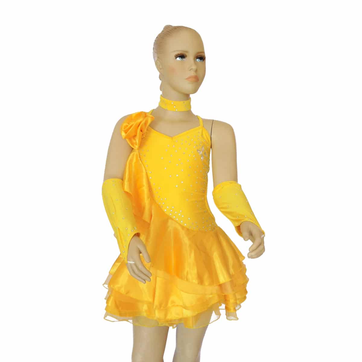 Abito da ballo intero per ragazza e bambina, con volant che percorre tutto il corpo dalla spalla alla gonna e fiore laterale. Presenti luminosi strass e pietre a goccia sul busto e la gonna è realizzata con più balze. Collana e guanti inclusi.