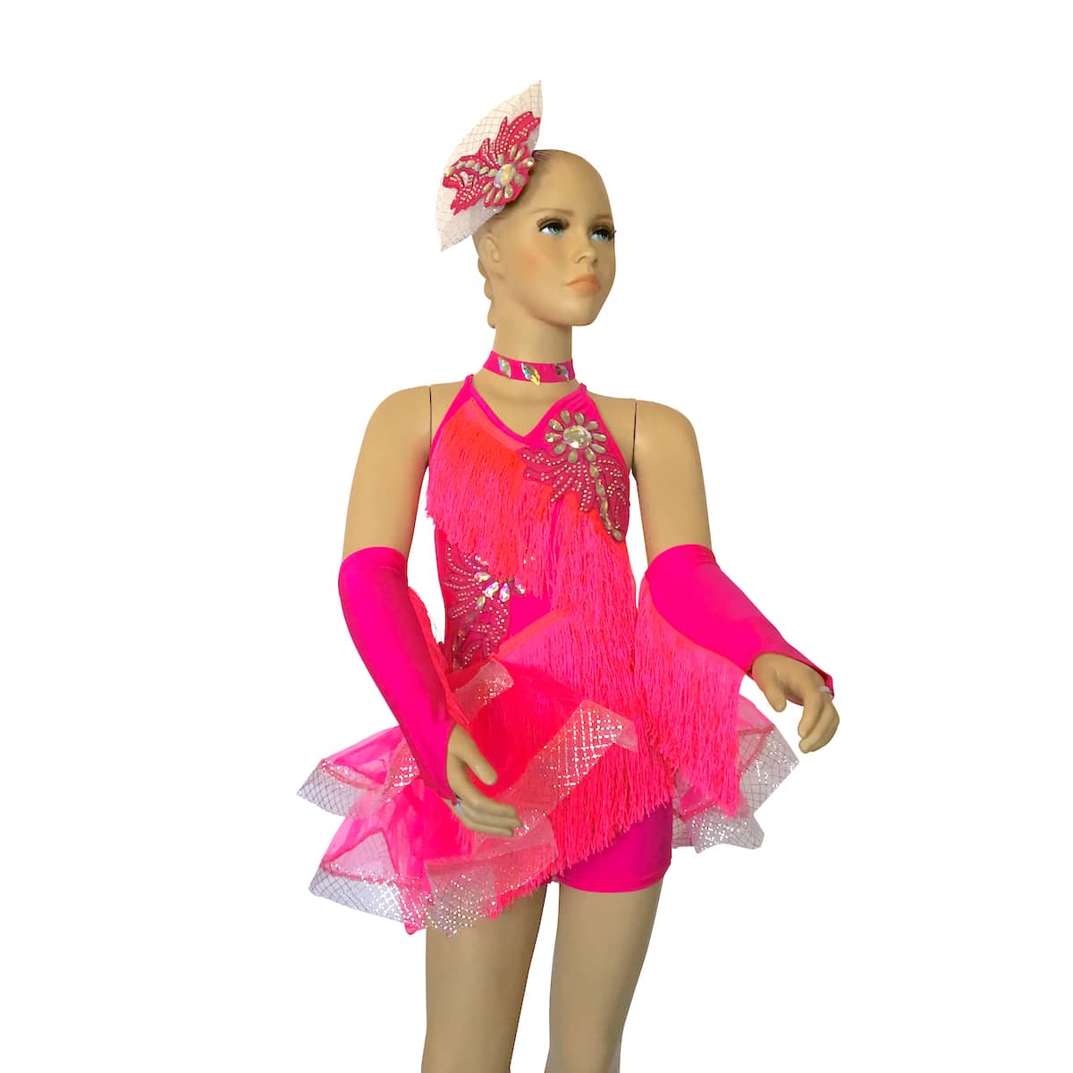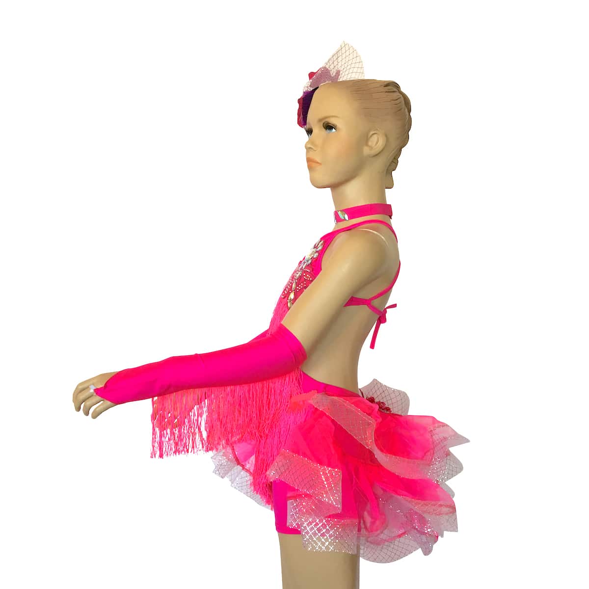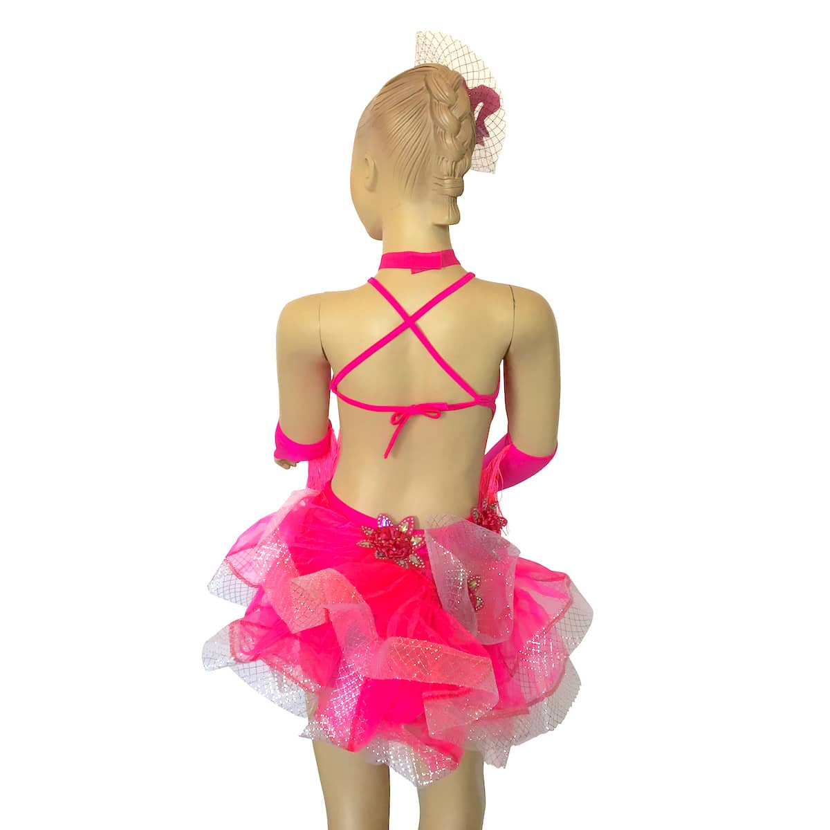 Abito da ballo intero per bambina indicato per competizioni, realizzato in lycra e ampie balze in organza, arricchito da accessori quali collana, guanti e applicazione per capelli. E’ incluso il pantaloncino.