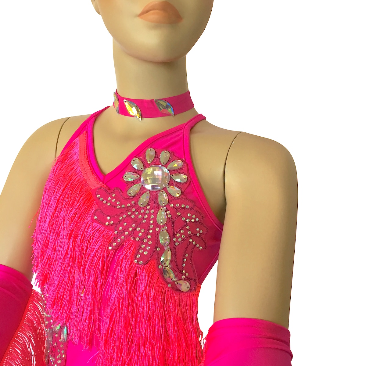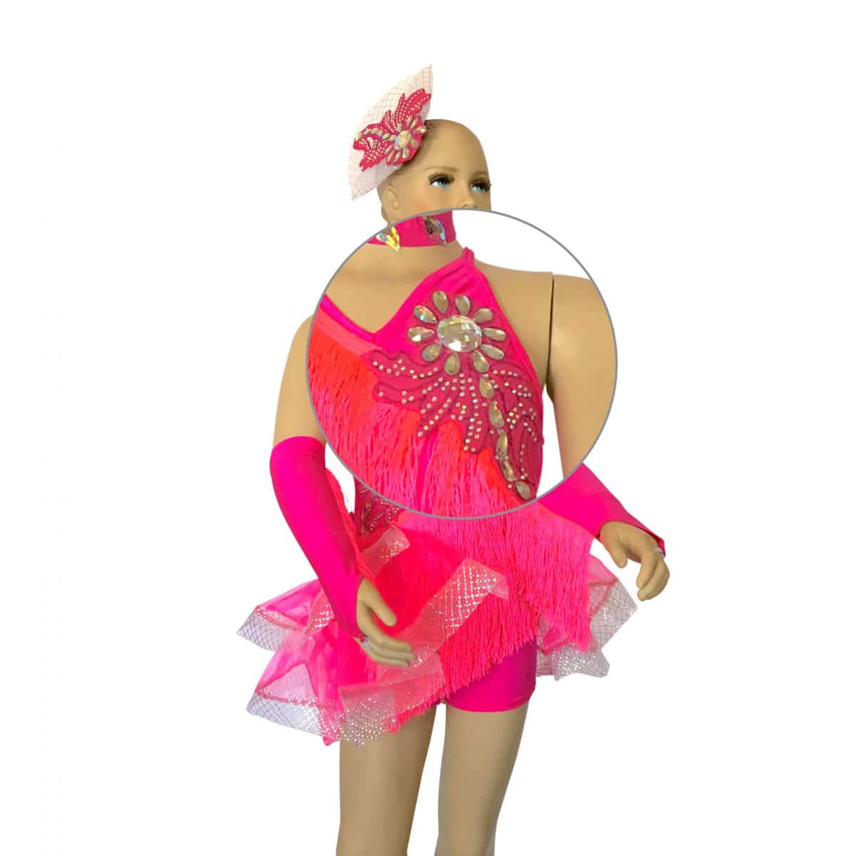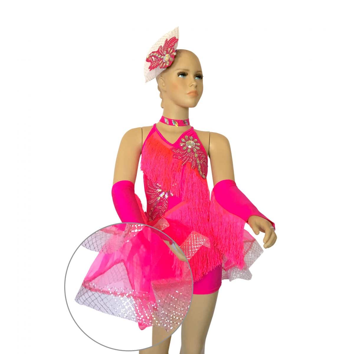 Abito da ballo intero per bambina indicato per competizioni, realizzato in lycra e ampie balze in organza, arricchito da accessori quali collana, guanti e applicazione per capelli. E’ incluso il pantaloncino.