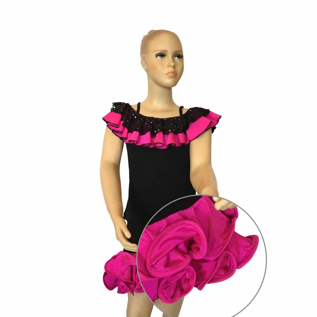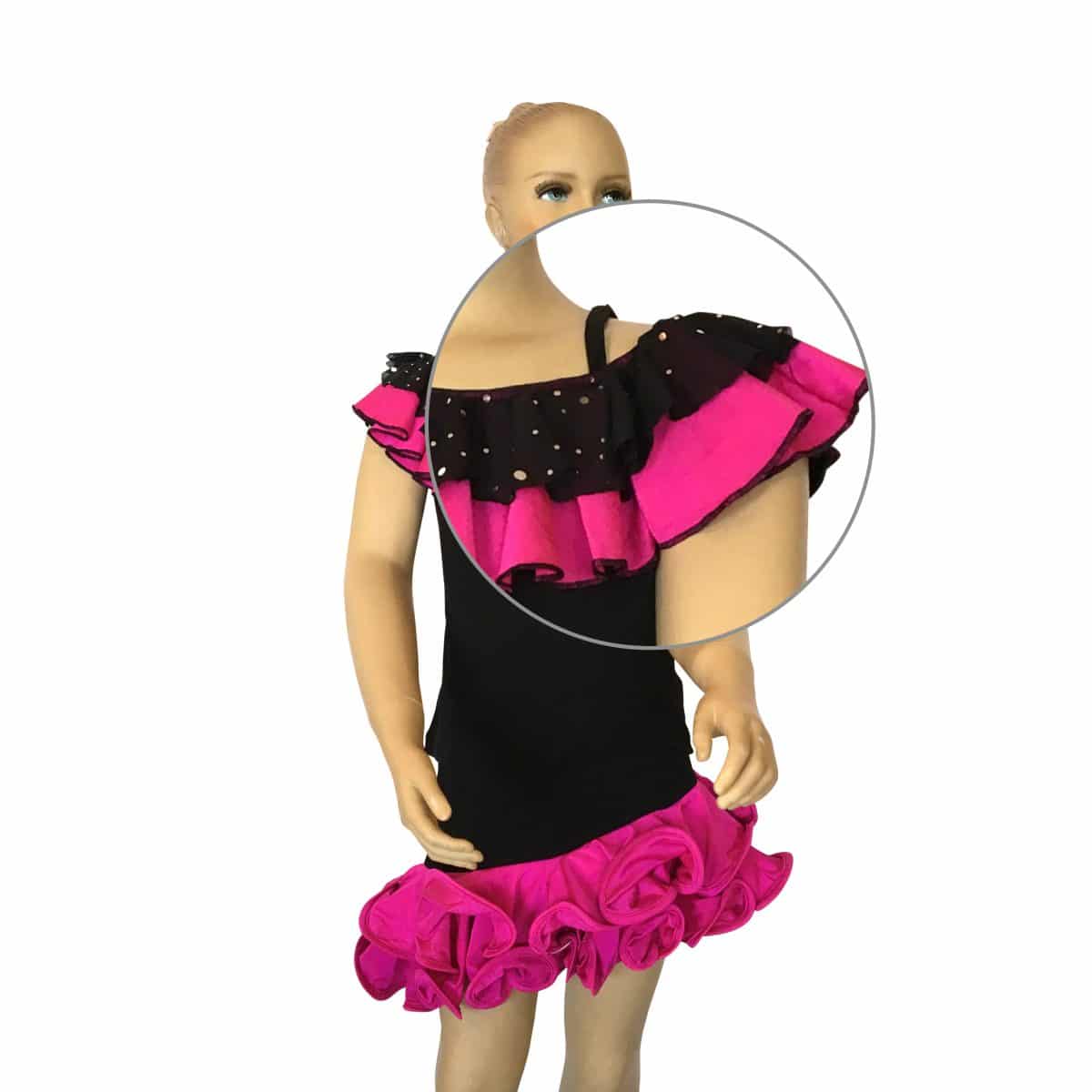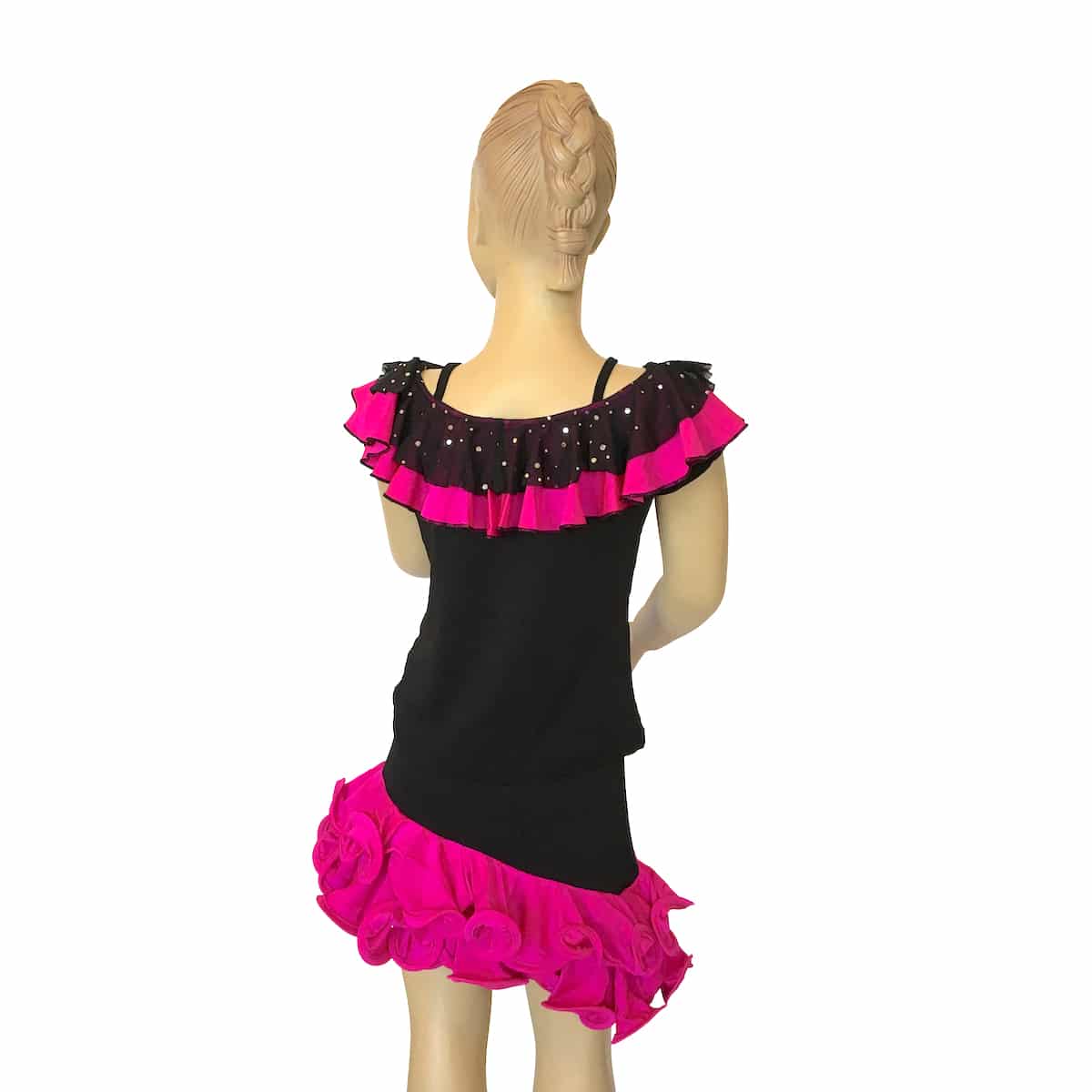 Completo da ballo ideale per social dance con top e gonna in maglina. La scollatura del top è arricchita con ricci in tessuto e paillettes che richiamano i ricci della gonna.