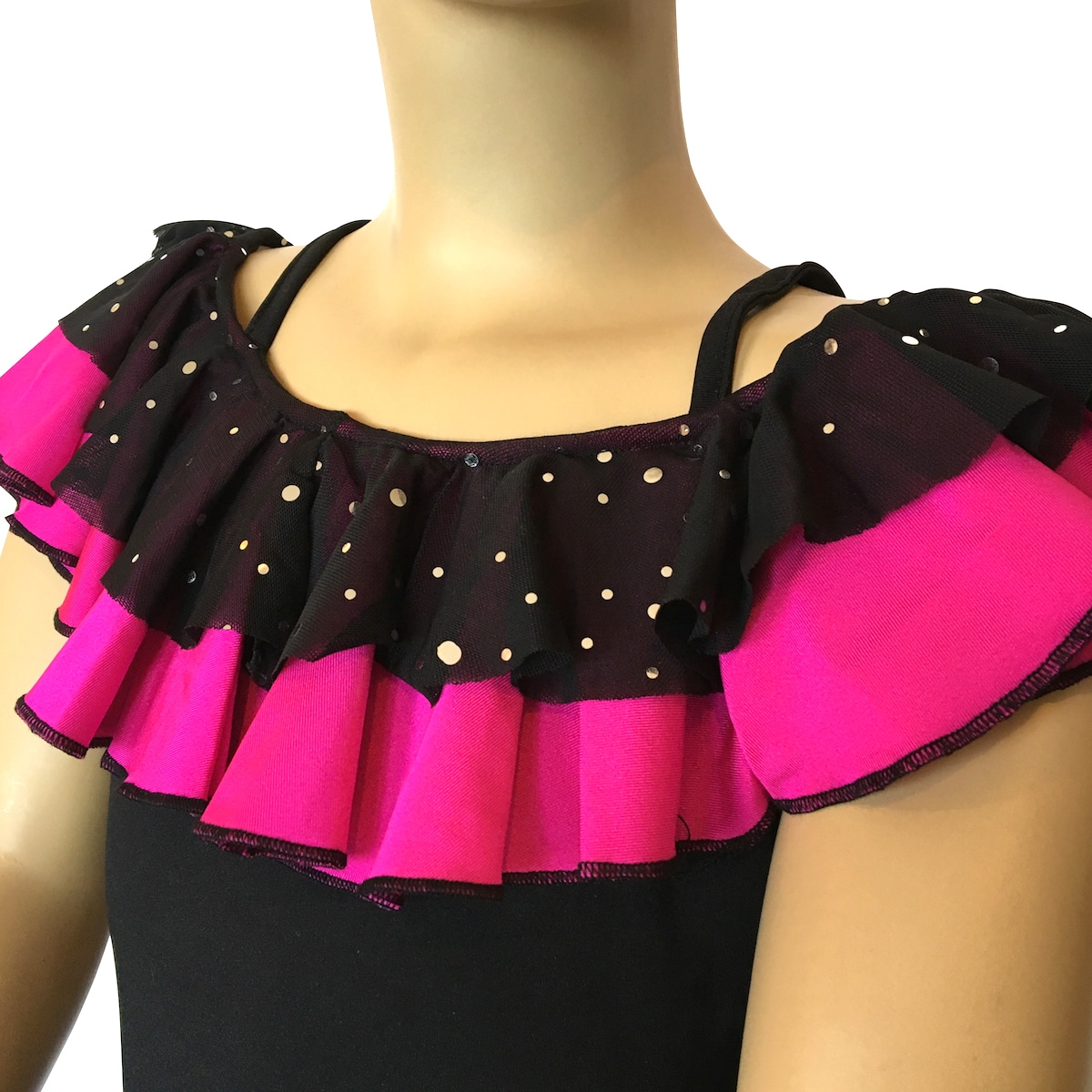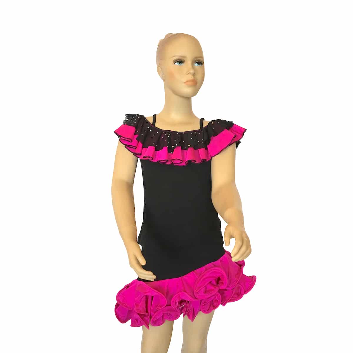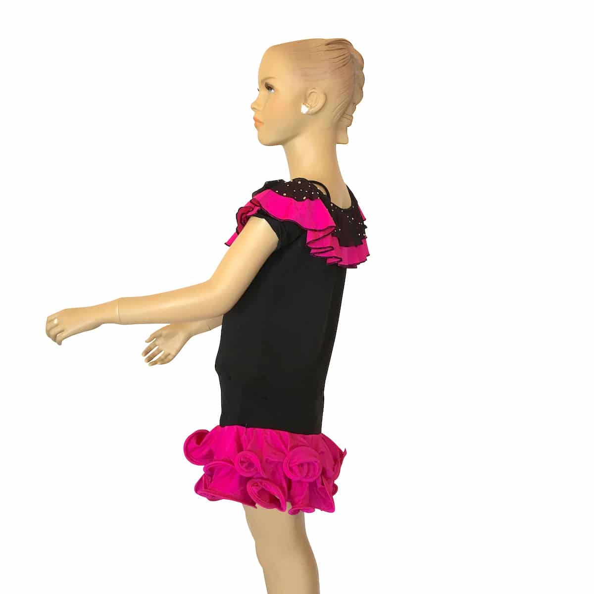 Completo da ballo ideale per social dance con top e gonna in maglina. La scollatura del top è arricchita con ricci in tessuto e paillettes che richiamano i ricci della gonna.