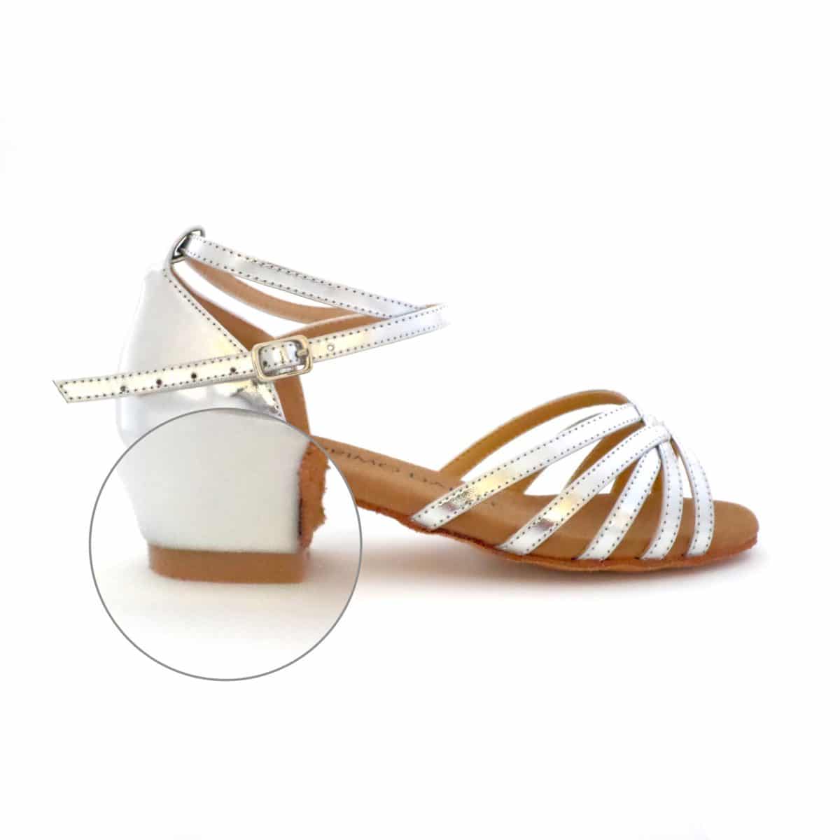 Scarpe da ballo a 5 fasce con comodi intrecci anteriori per bambina di colore argento. E’ il modello più utilizzato per allenamento e competizioni di coppia e gruppi.