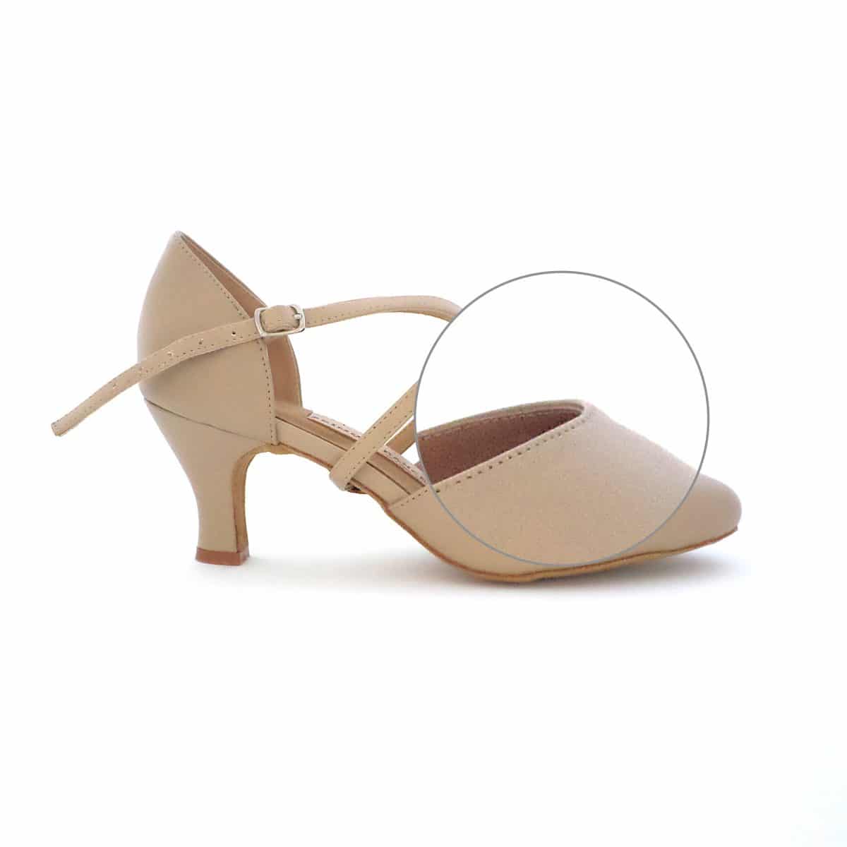 Scarpe da ballo in morbida pelle beige a punta chiusa, con scollatura sul davanti e comoda allacciatura intorno la caviglia per donare eleganza e confort al piede.