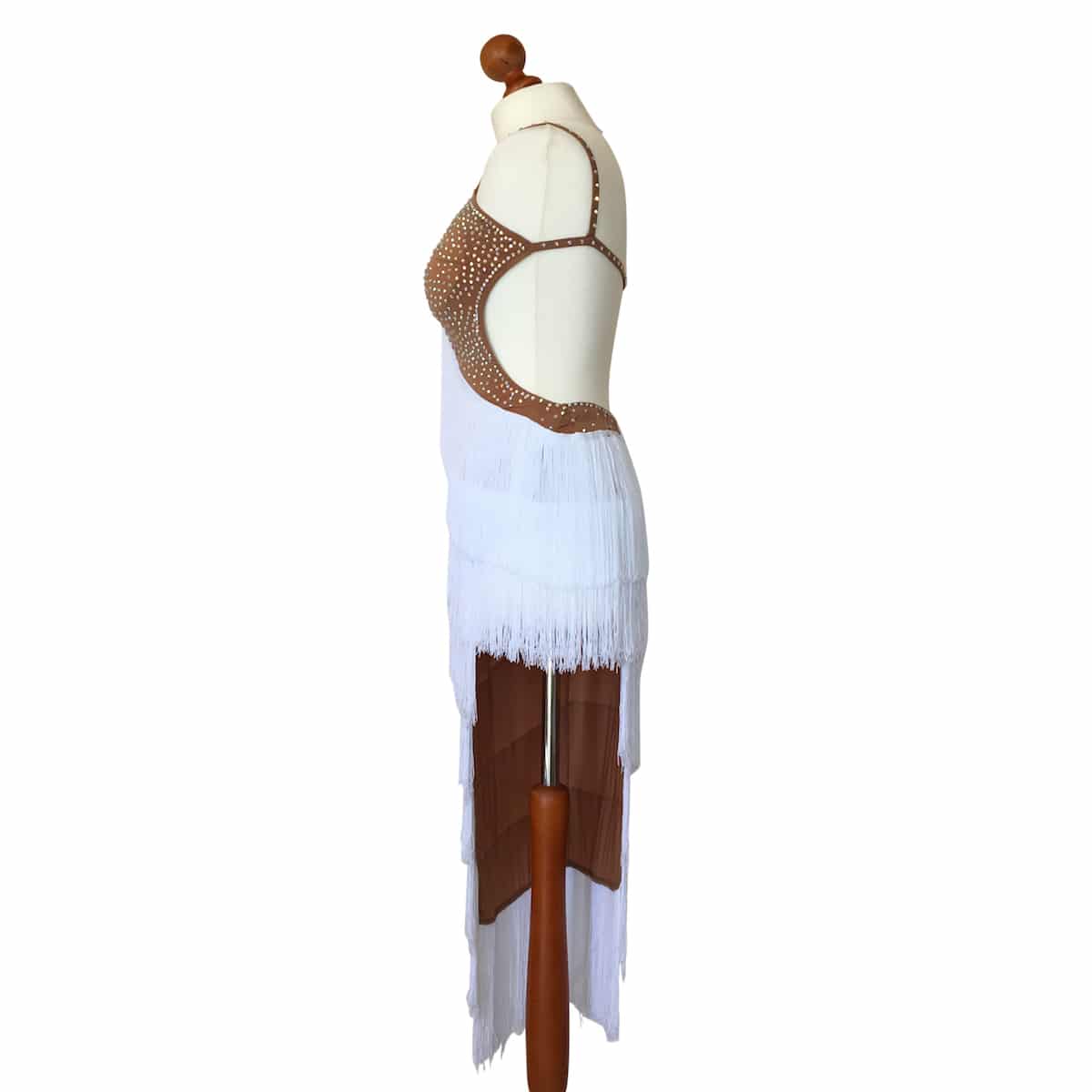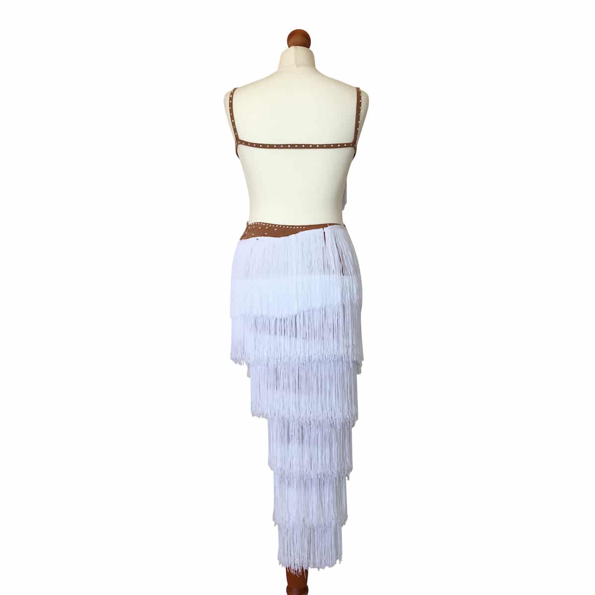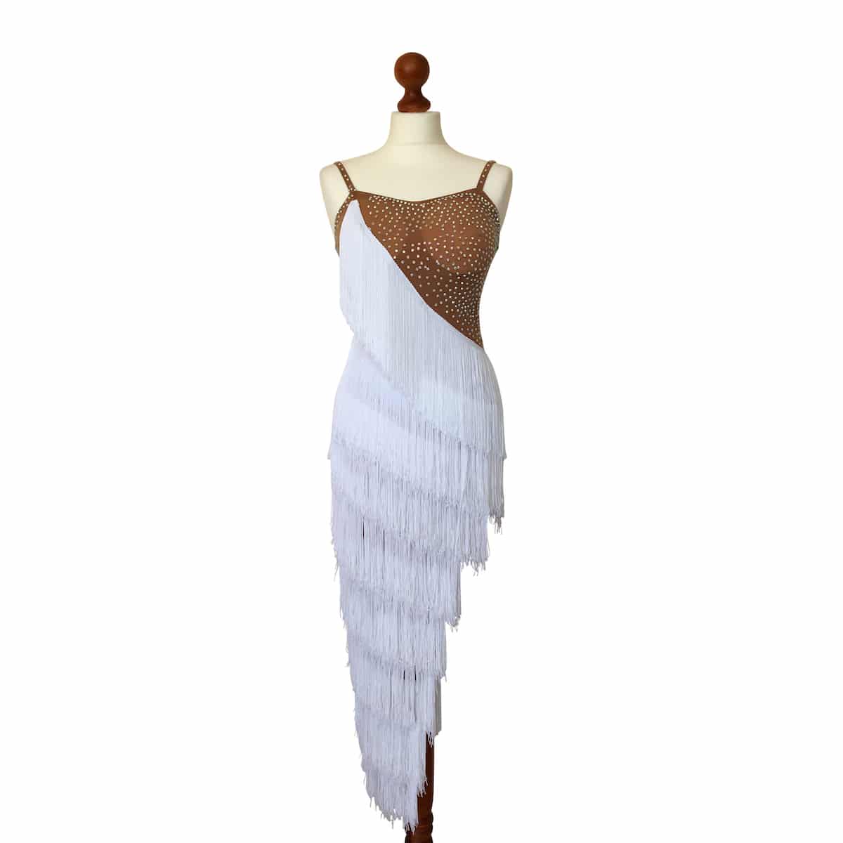 Abito da ballo intero per ragazza e bambina indicato per competizioni, realizzato in lycra color carne e folta frangia trasversale bianca. Luminosi strass PD su tutto il body donano un tocco di lucentezza e classe.