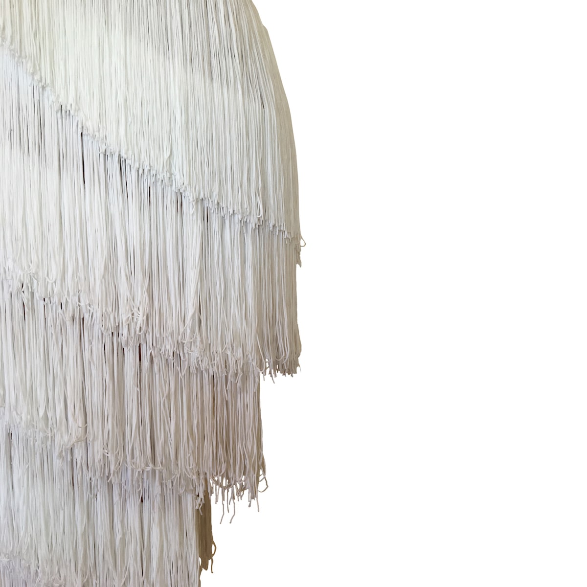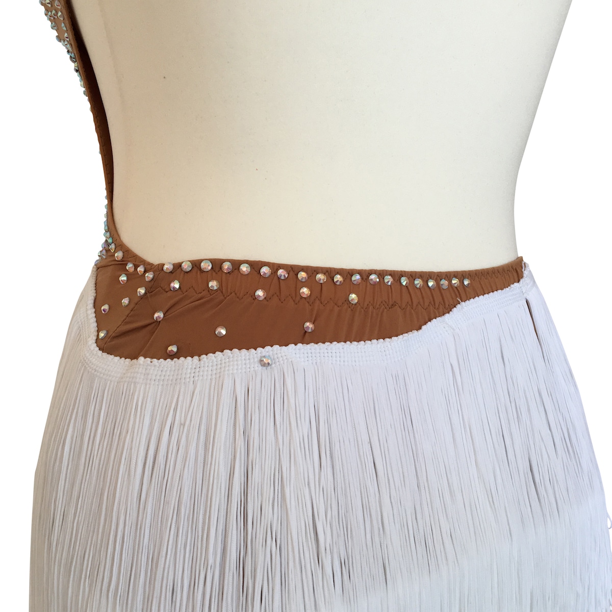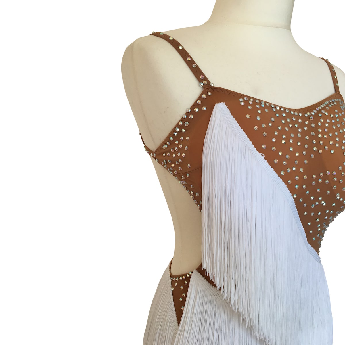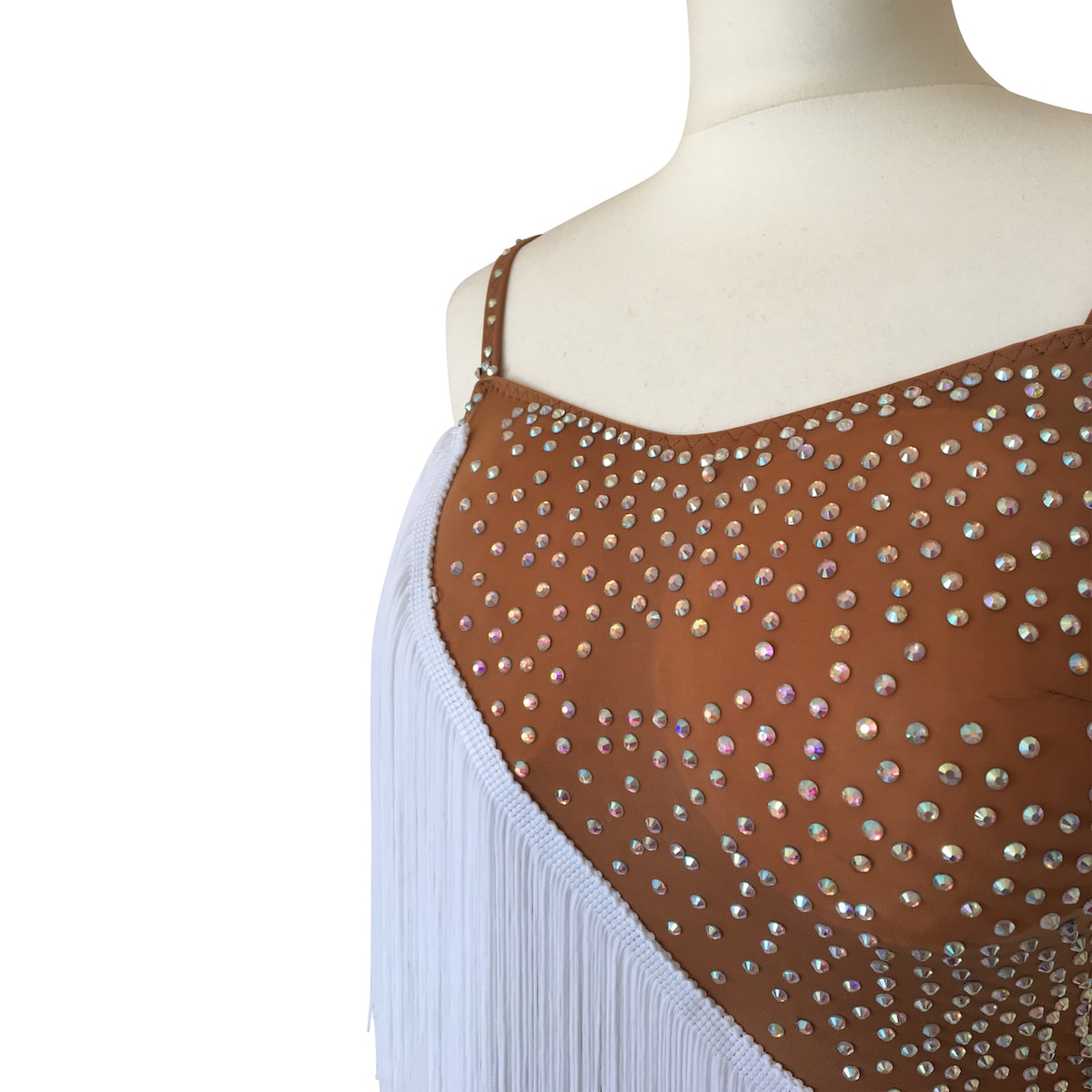 Abito da ballo intero per ragazza e bambina indicato per competizioni, realizzato in lycra color carne e folta frangia trasversale bianca. Luminosi strass PD su tutto il body donano un tocco di lucentezza e classe.