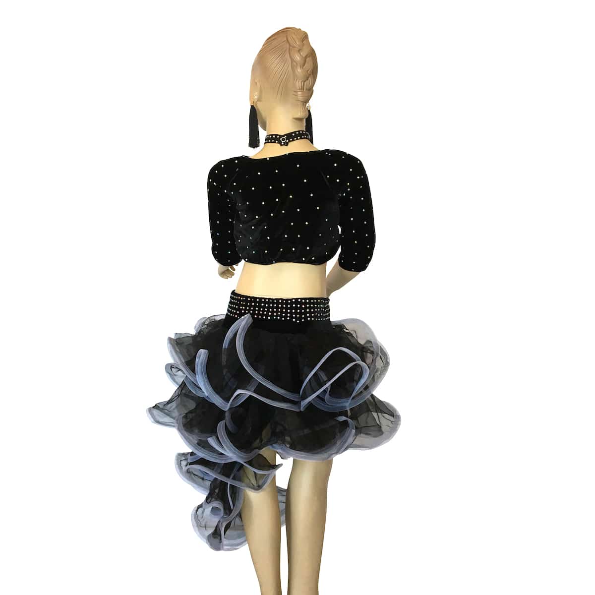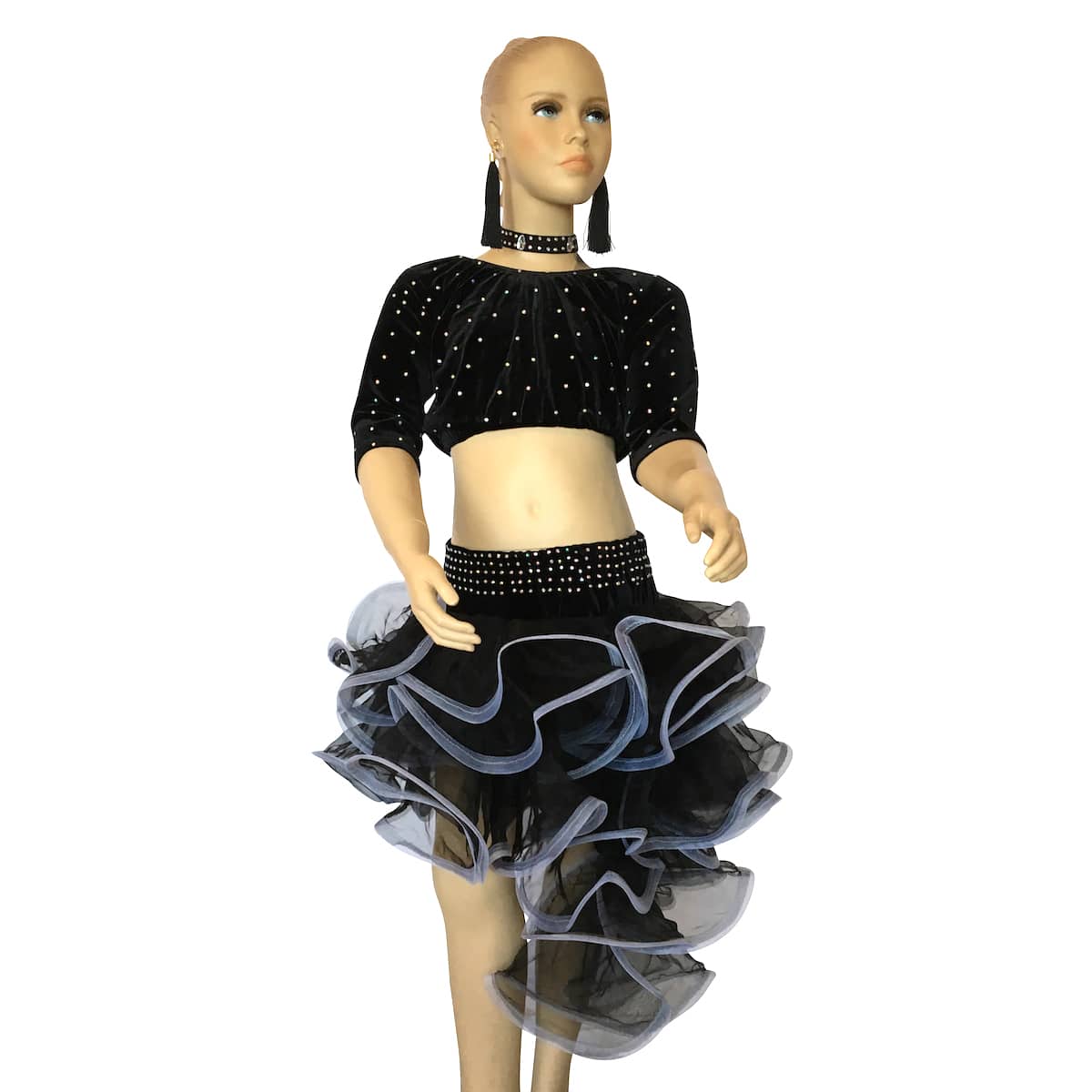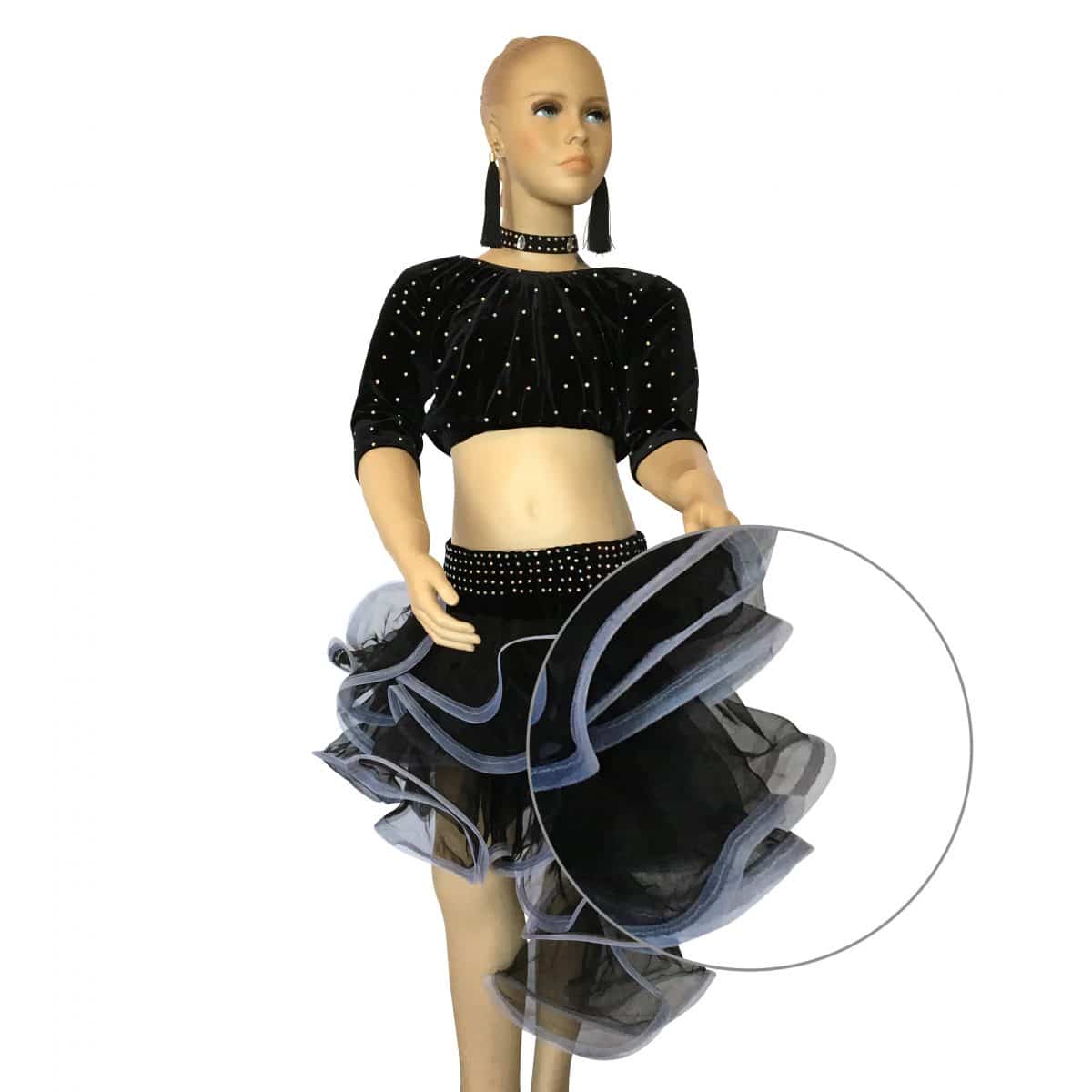 Completo da ballo danze latine e caraibiche, con top in vellutino e strass e gonna a balze in organza trasversali di due colori. Orecchini e collana inclusi.