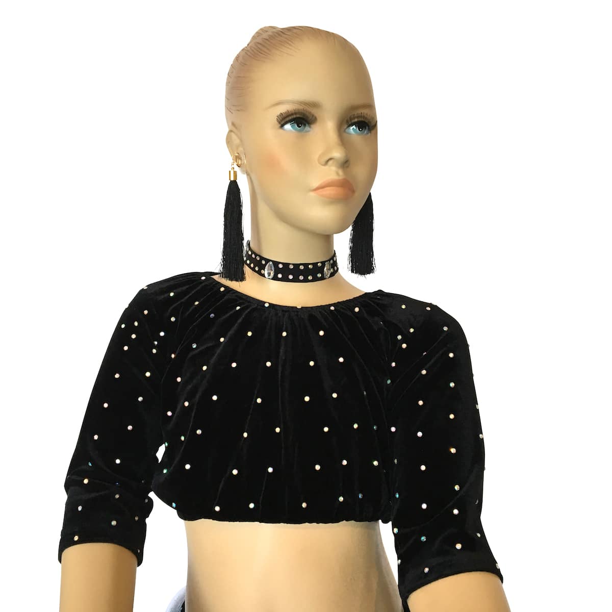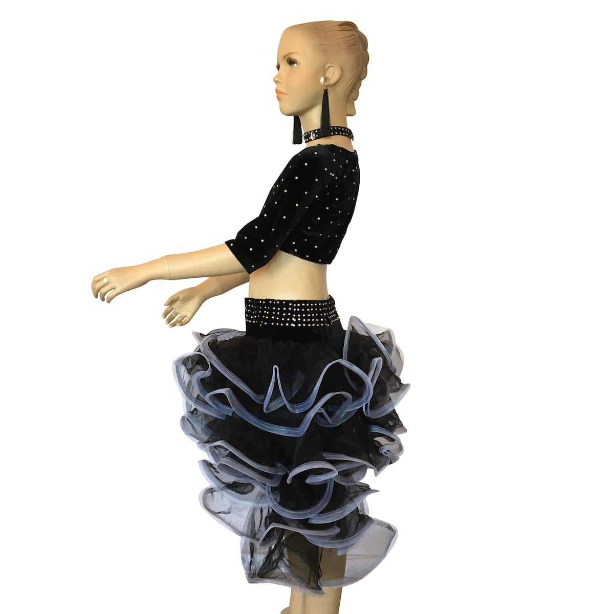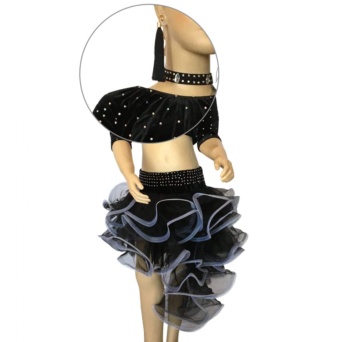 Completo da ballo danze latine e caraibiche, con top in vellutino e strass e gonna a balze in organza trasversali di due colori. Orecchini e collana inclusi.