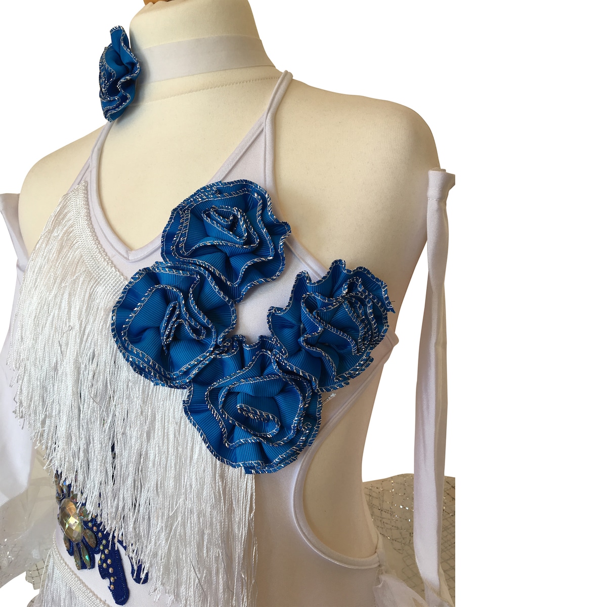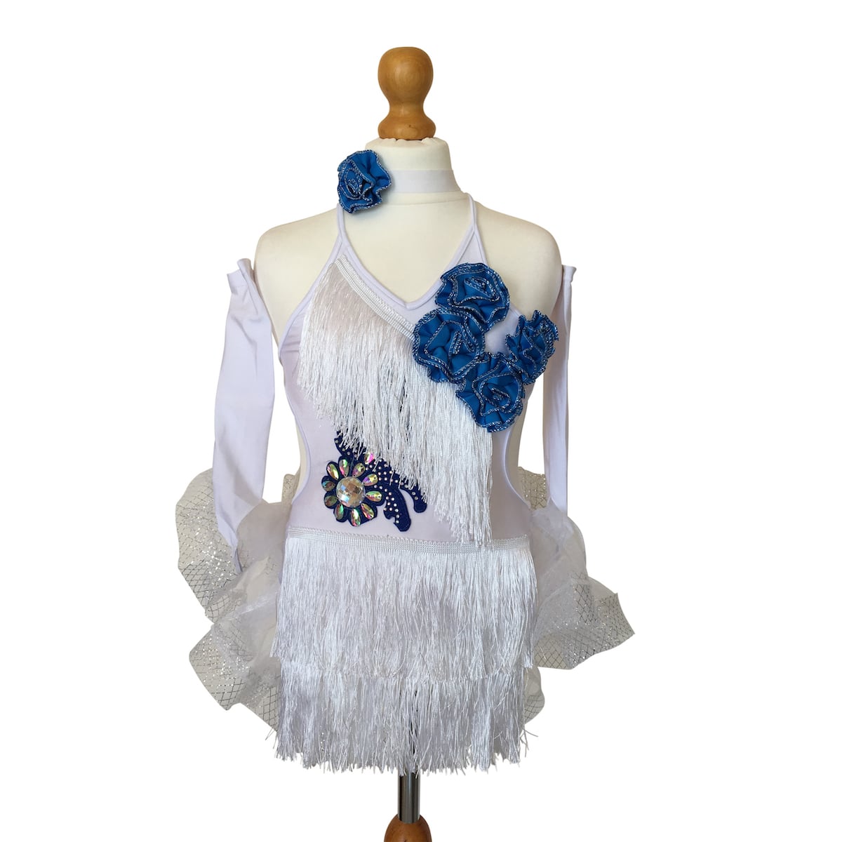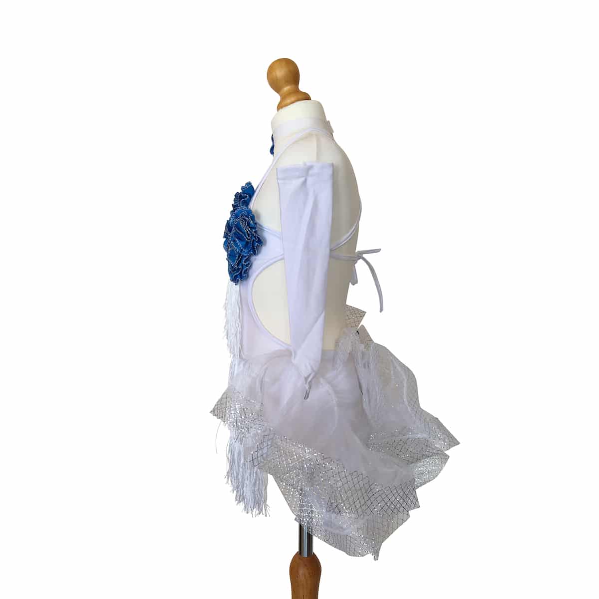 Abito da ballo intero per bambina in tessuto elasticizzato e frangia bianca, con rose blu sul busto e applicazione di strass e pietre sul fianco destro. Il retro della gonna è in organza con ricci e presenta un disegno floreale di colore blu. Guanti e collana inclusi.