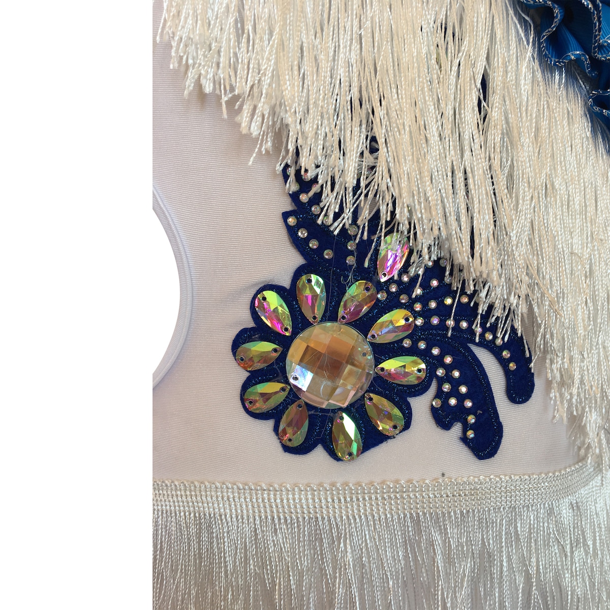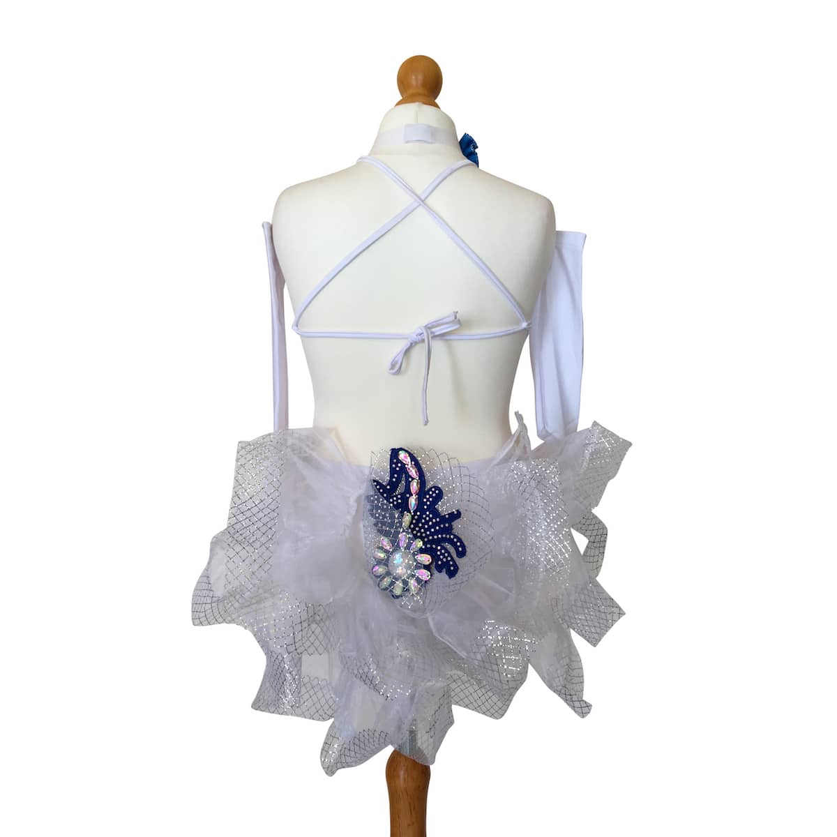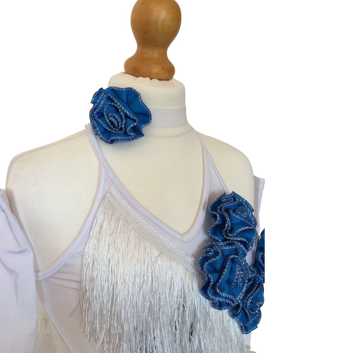 Abito da ballo intero per bambina in tessuto elasticizzato e frangia bianca, con rose blu sul busto e applicazione di strass e pietre sul fianco destro. Il retro della gonna è in organza con ricci e presenta un disegno floreale di colore blu. Guanti e collana inclusi.