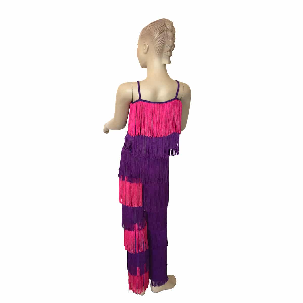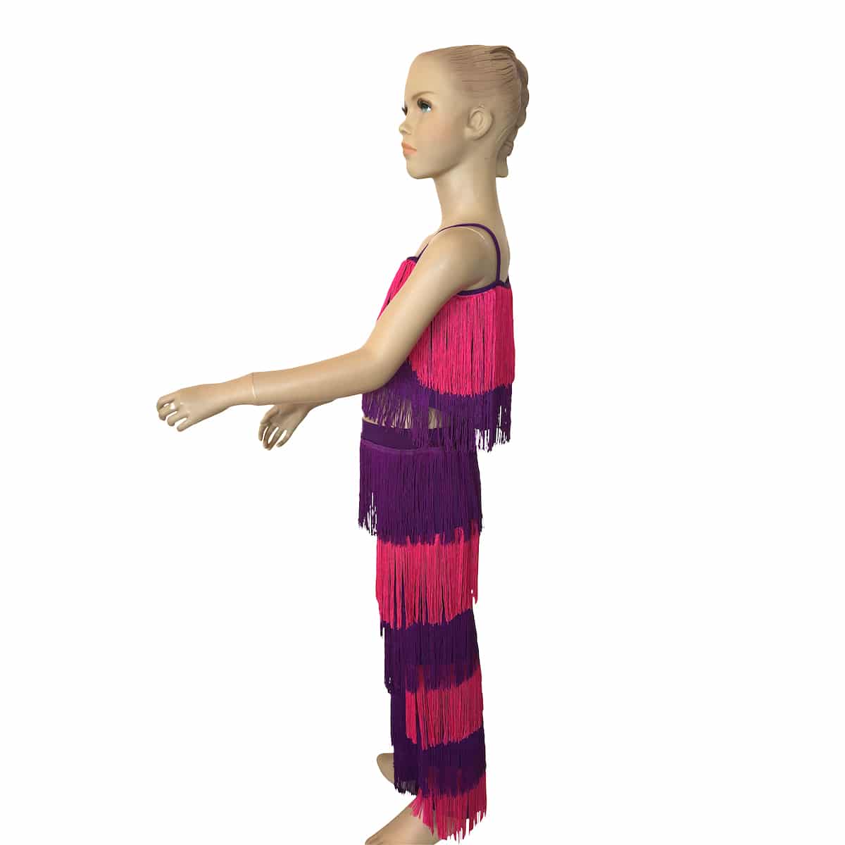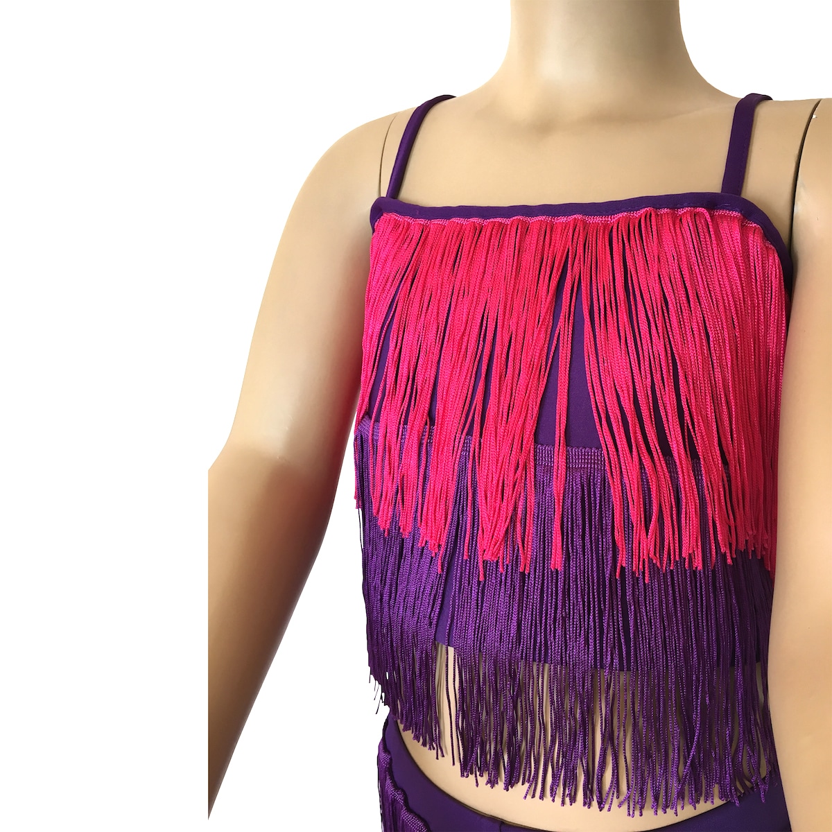 Completo da ballo in frangia bicolore fucsia e viola. Top con bratelline e pantalone con elastico in vita.