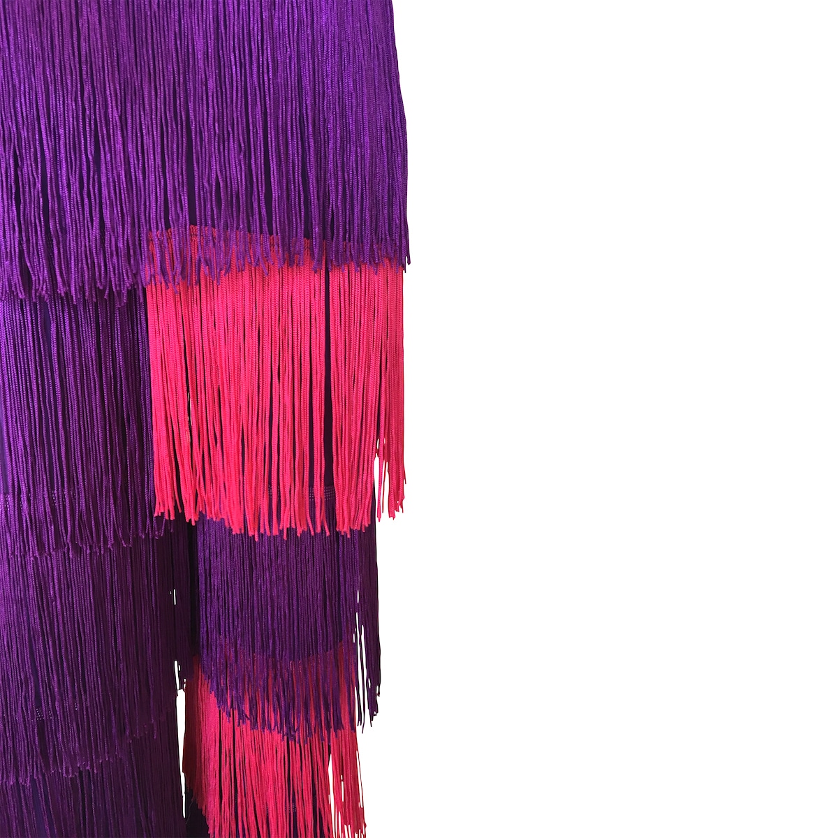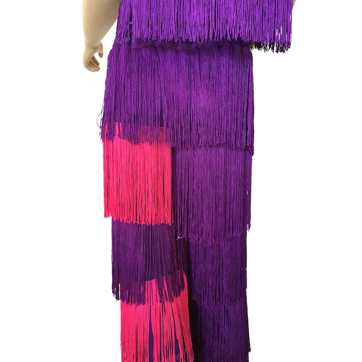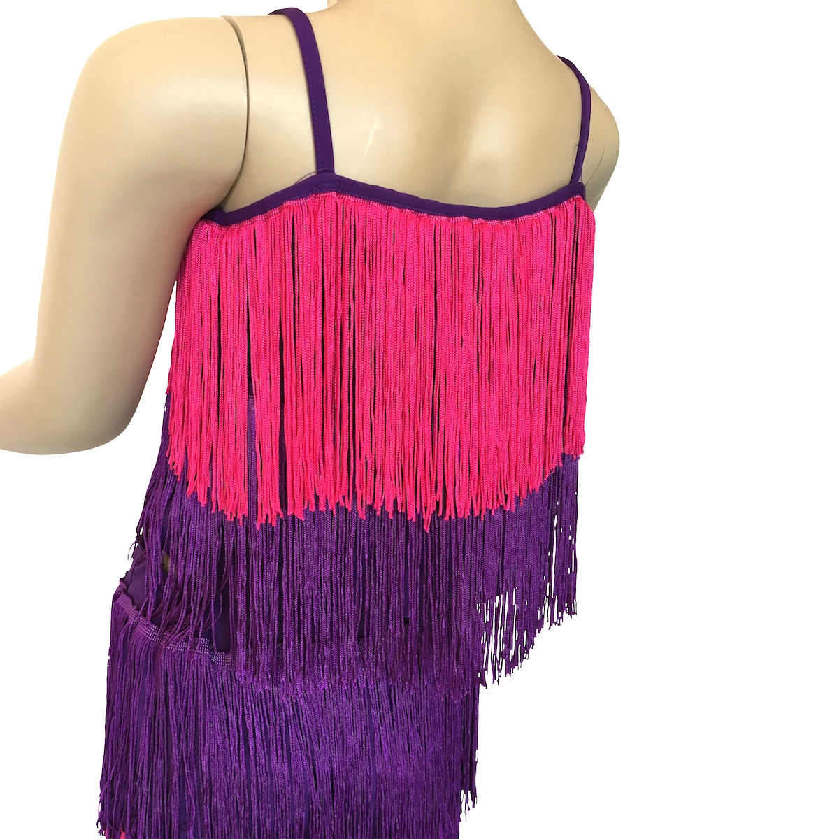 Completo da ballo in frangia bicolore fucsia e viola. Top con bratelline e pantalone con elastico in vita.