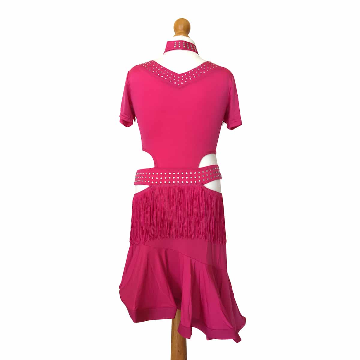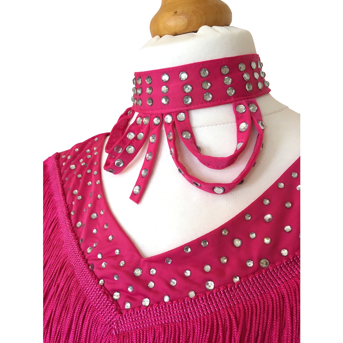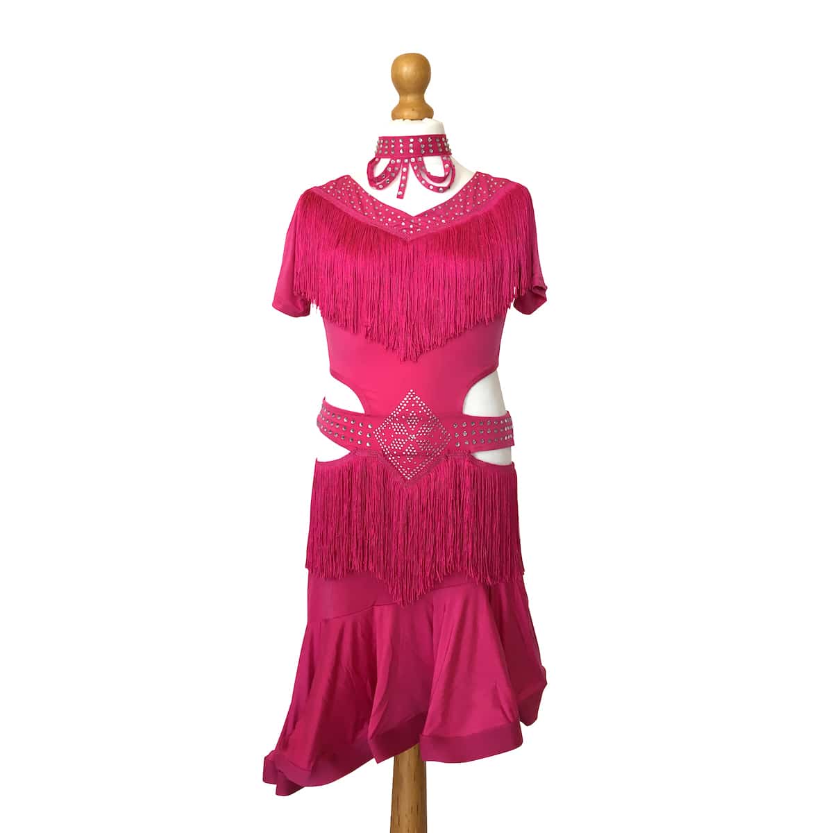 Abito da ballo intero in tessuto elasticizzato da bambina e ragazza. La scollatura e la vita sono evidenziate da frange in tinta unita, la cintura in strass impreziosisce l’abito con la sua luminosità. Gonna con balza trasversale destra. Collana inclusa.