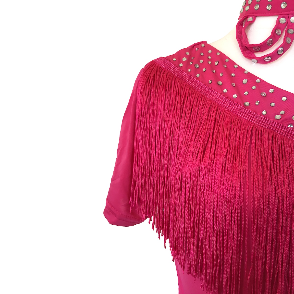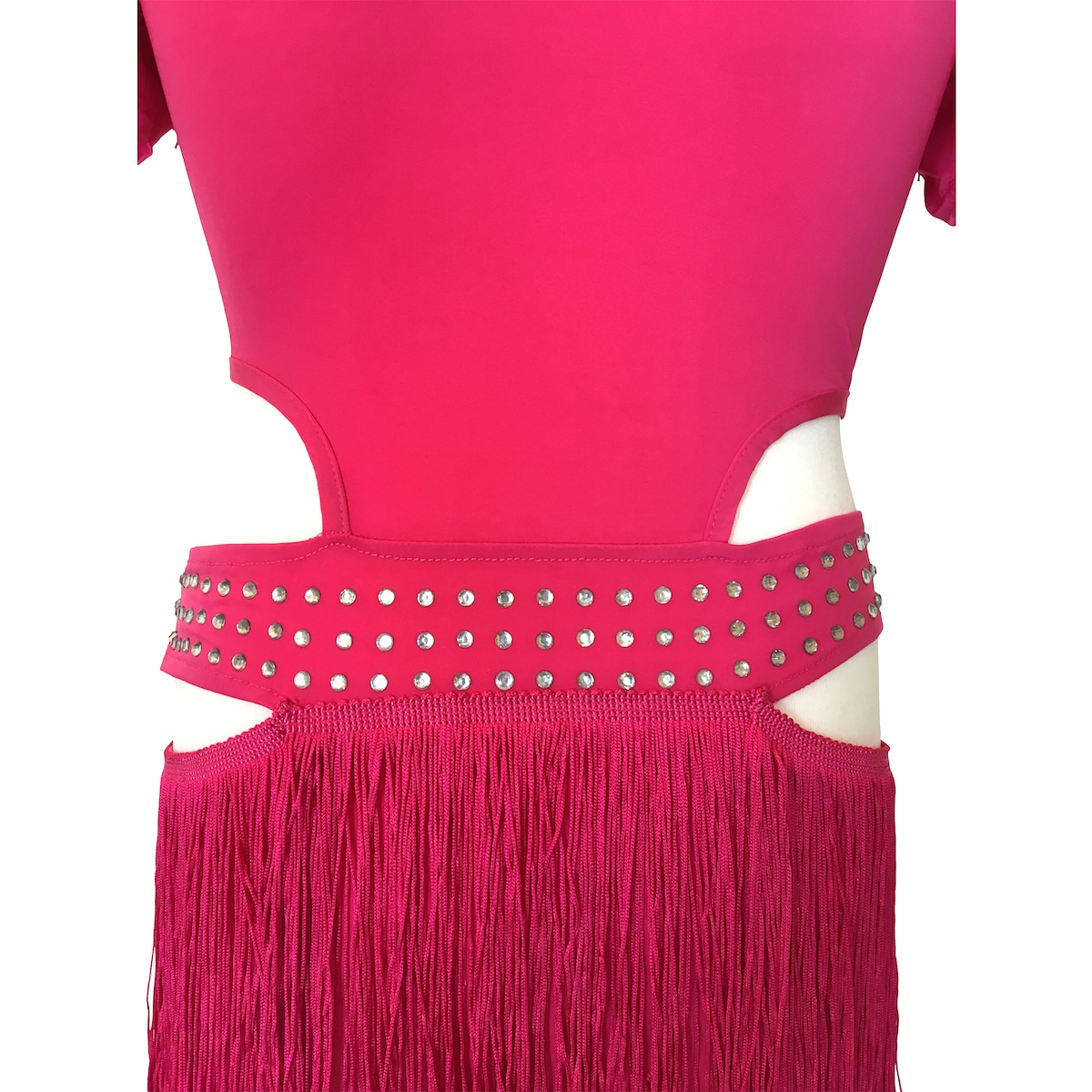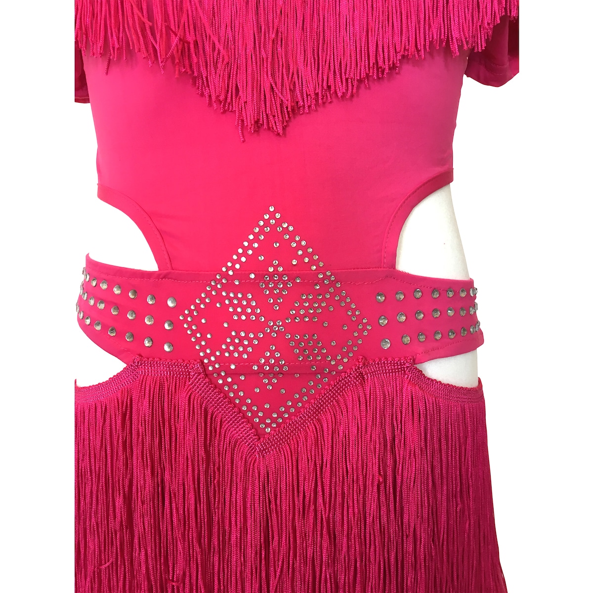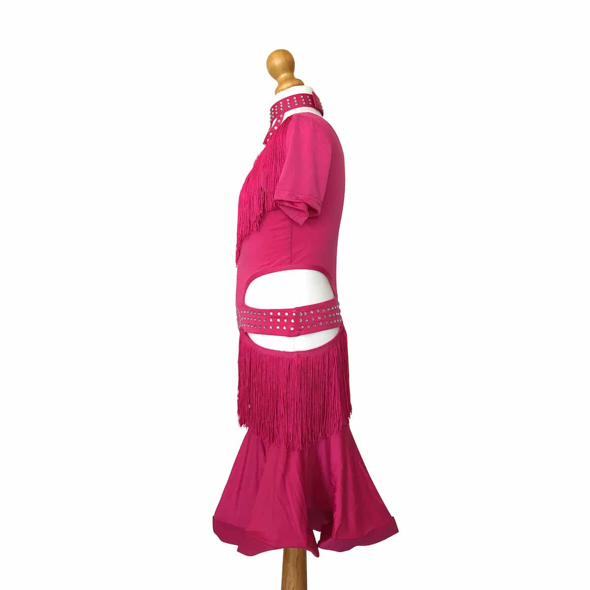 Abito da ballo intero in tessuto elasticizzato da bambina e ragazza. La scollatura e la vita sono evidenziate da frange in tinta unita, la cintura in strass impreziosisce l’abito con la sua luminosità. Gonna con balza trasversale destra. Collana inclusa.
