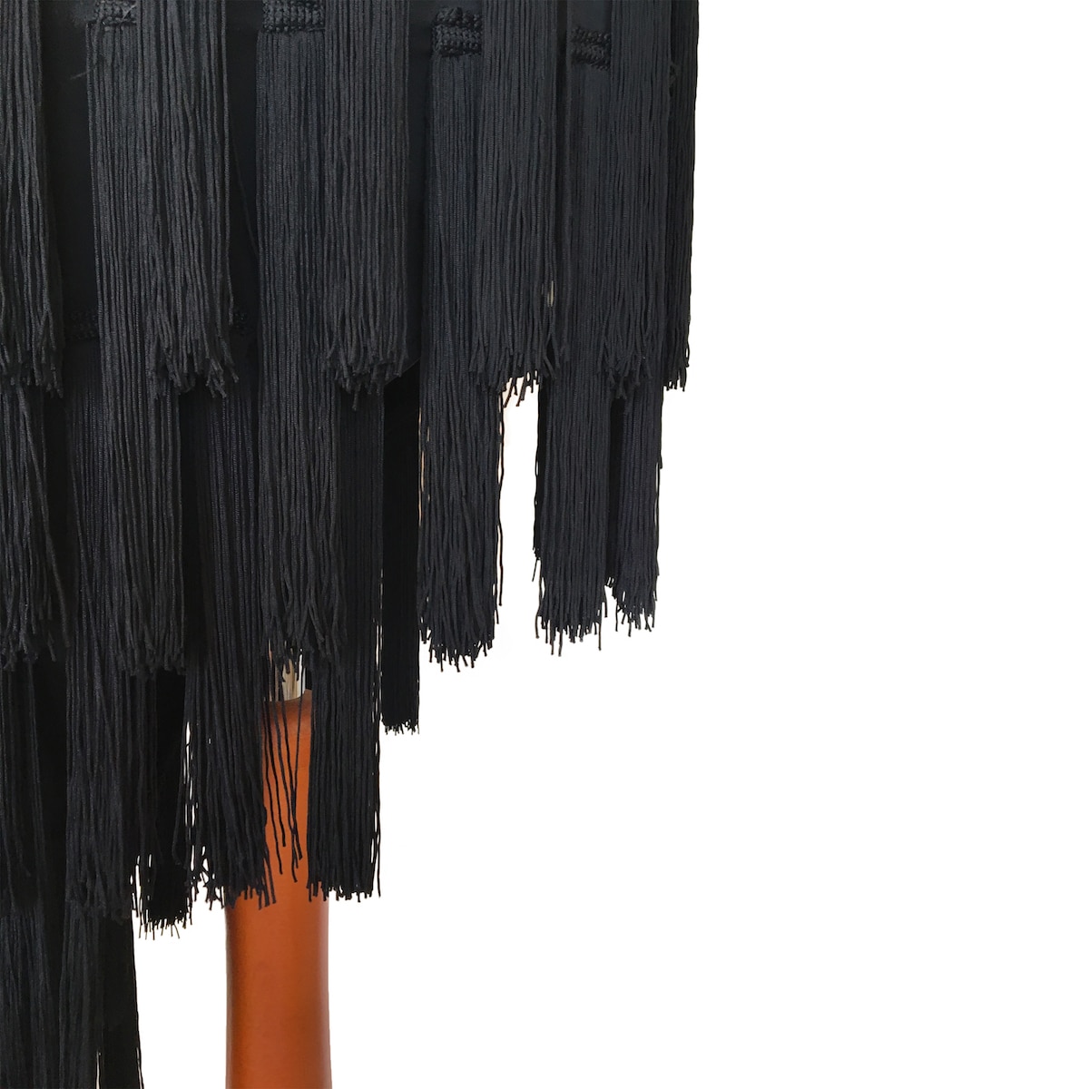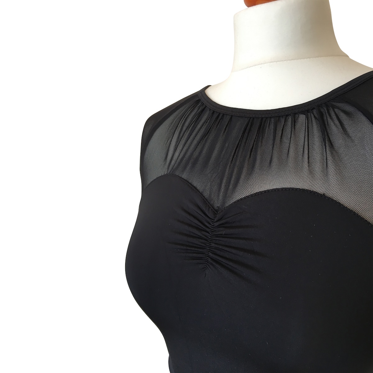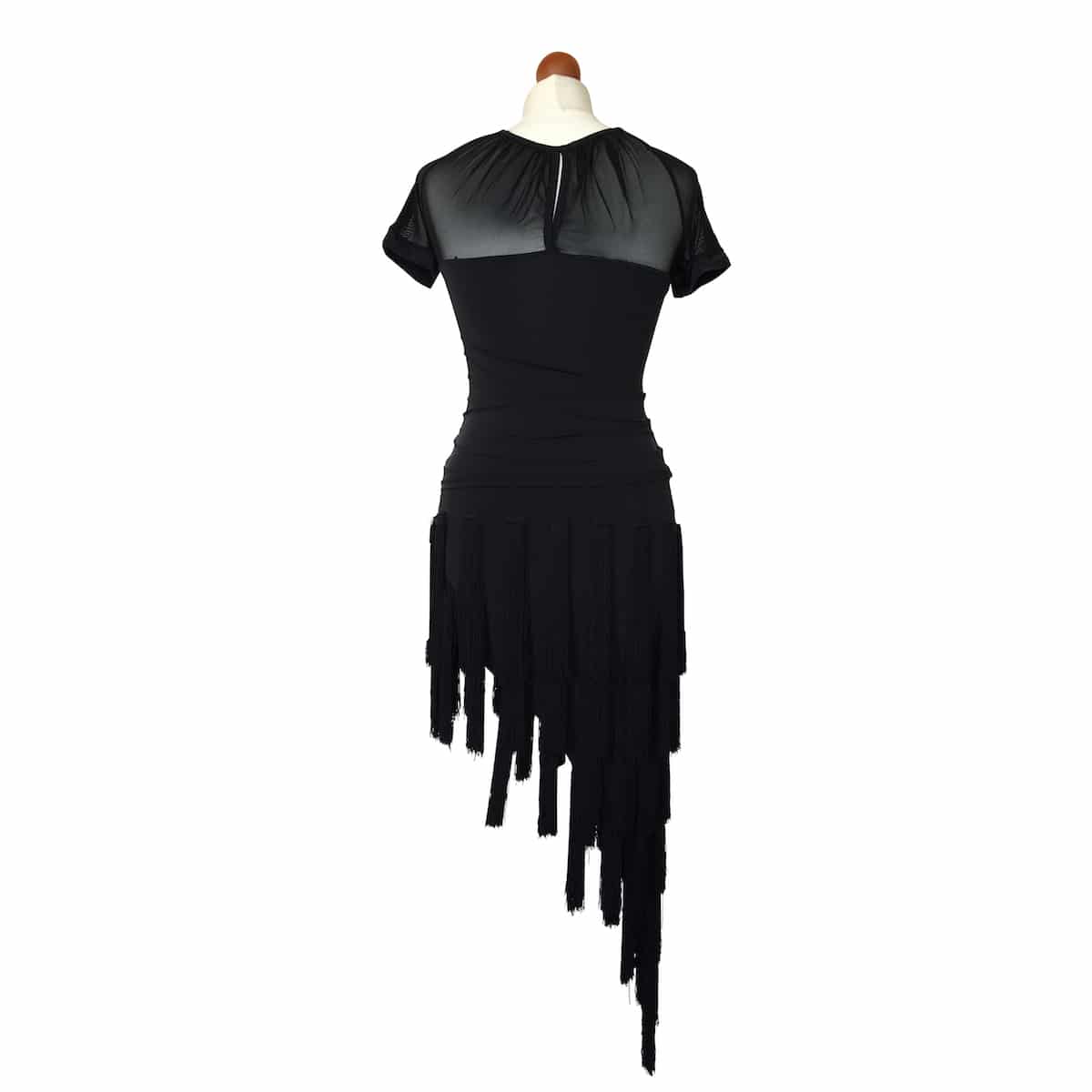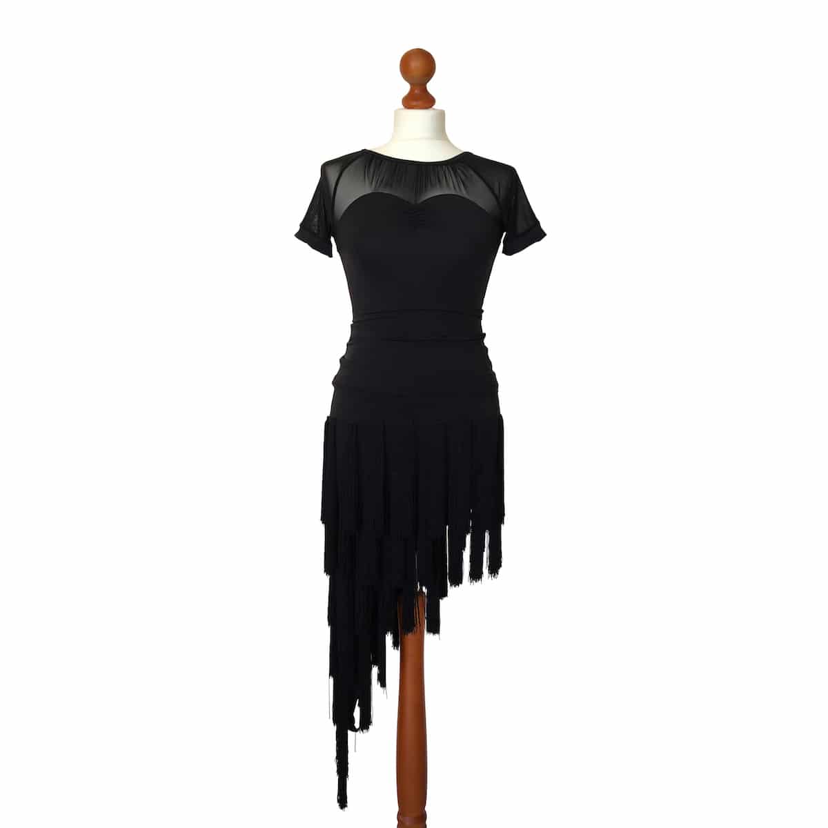 Completo da ballo e allenamento per donna, formato da top in tessuto elasticizzato e rete. La gonna presenta una originale serie di giri di folta frangia trasversale.